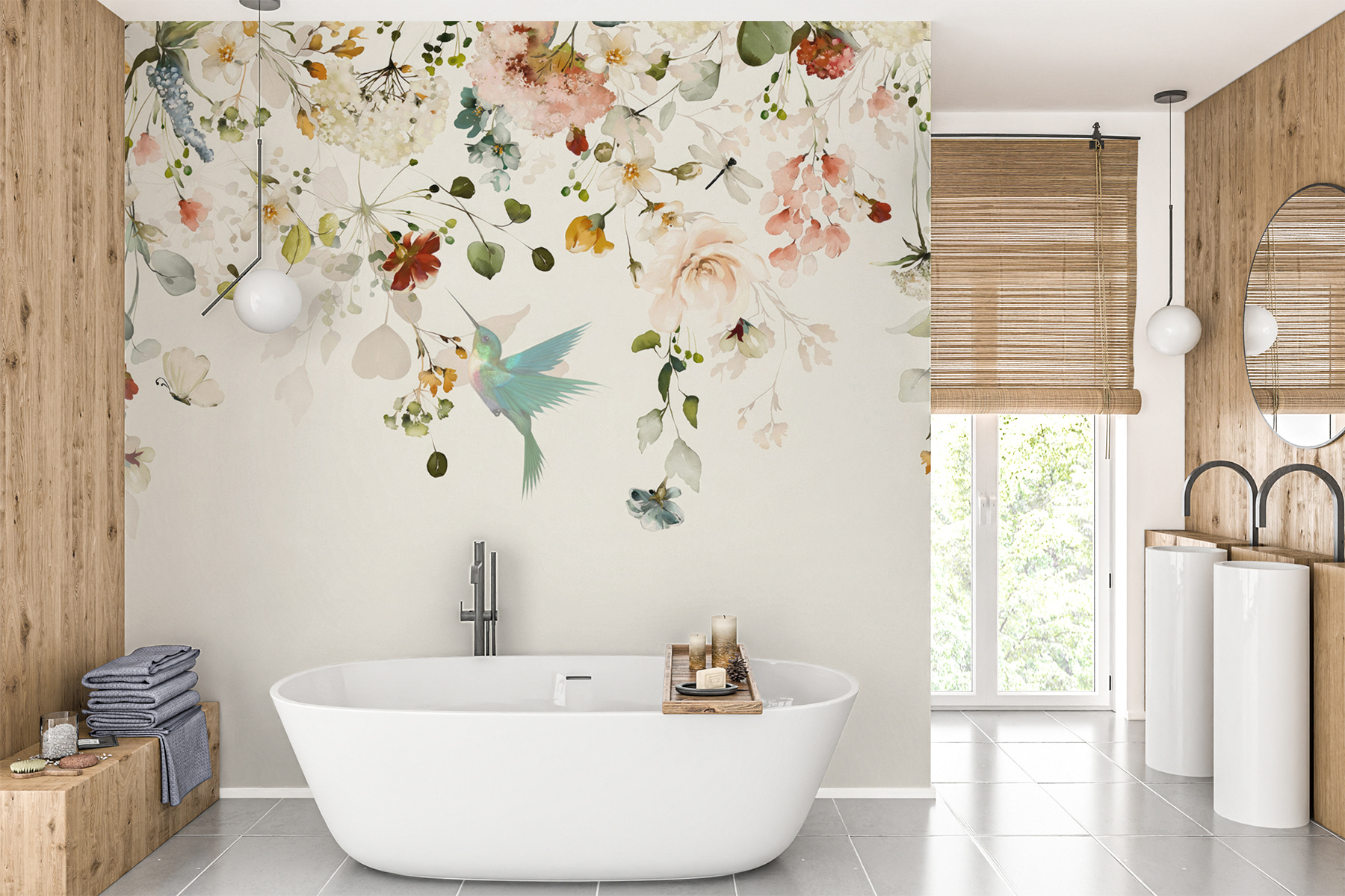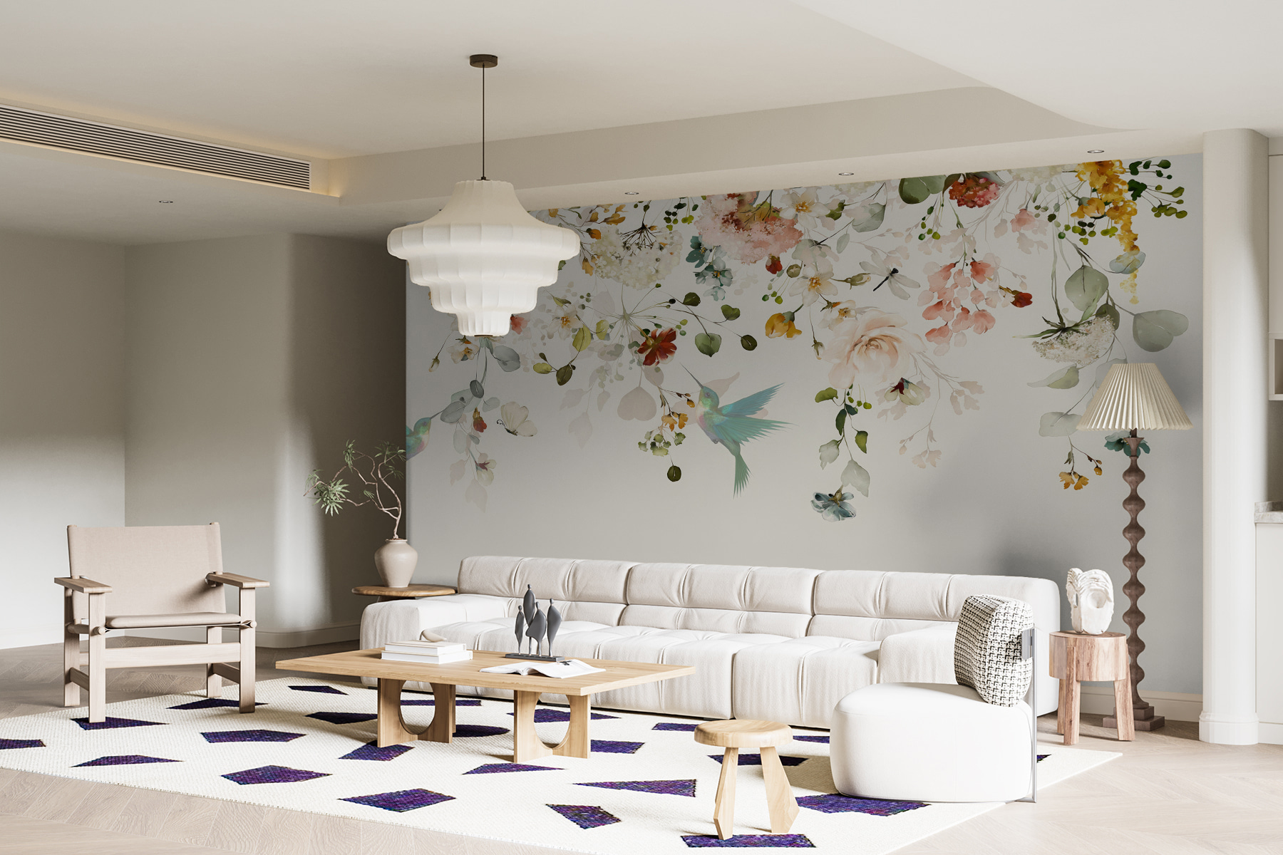Este mural tem uma beleza serena que é simplesmente… calmante. Esses tons pastel e detalhes intrincados? Dão-lhe um ar acolhedor e elegante. Além disso, aquele beija-flor – tão giro e caprichoso, certo? É quase como se conseguíssemos ouvir o zumbido das suas pequenas asas. Quer esteja a enrolar-se com um livro ou a conversar com amigos, este mural cria um cenário maravilhosamente tranquilo.