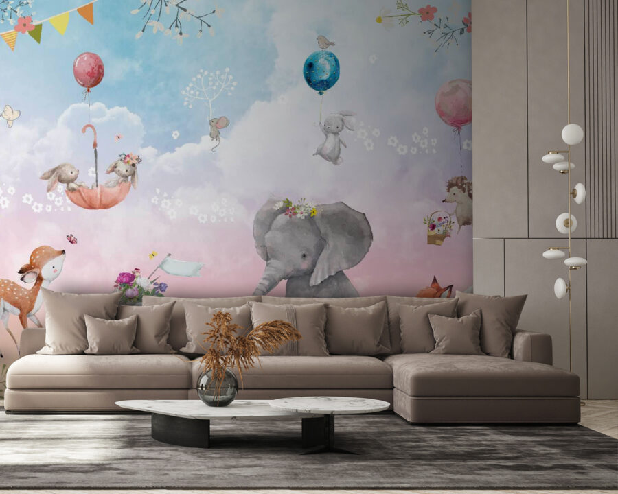 Transforme o seu espaço com este encantador mural de parede com animais caprichosos e balões alegres. Imagine um elefante gentil, adornado com flores, partilhando um momento com coelhos brincalhões e um ouriço curioso — todos a desfrutar de um céu pastel de sonho. É como uma cena de um livro de contos encantador!