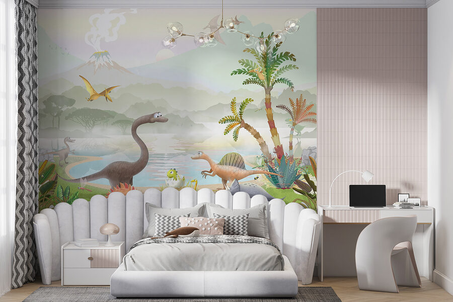 À procura de algo que faça o quarto de uma criança estalar de entusiasmo? Veja este adorável mural de parede com um pterodáctilo a voar alto sobre um mundo de dinossauros de desenhos animados. Imagine: dinossauros vibrantes a vaguear por aí, plantas pré-históricas exuberantes e um vulcão fumegante ao fundo – é como entrar numa máquina do tempo colorida! As crianças vão adorar apontar os seus dinossauros favoritos e fingir que voam ao lado do pterodáctilo. É perfeito para despertar a imaginação e dar um toque de cor divertido a qualquer divisão. Vai ser o pai mais fixe do bairro!