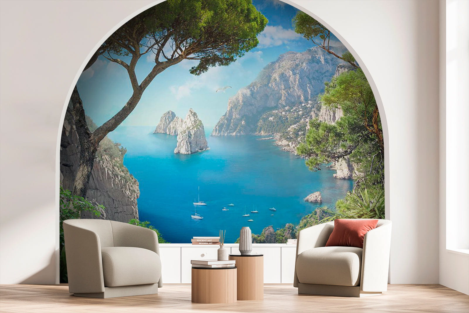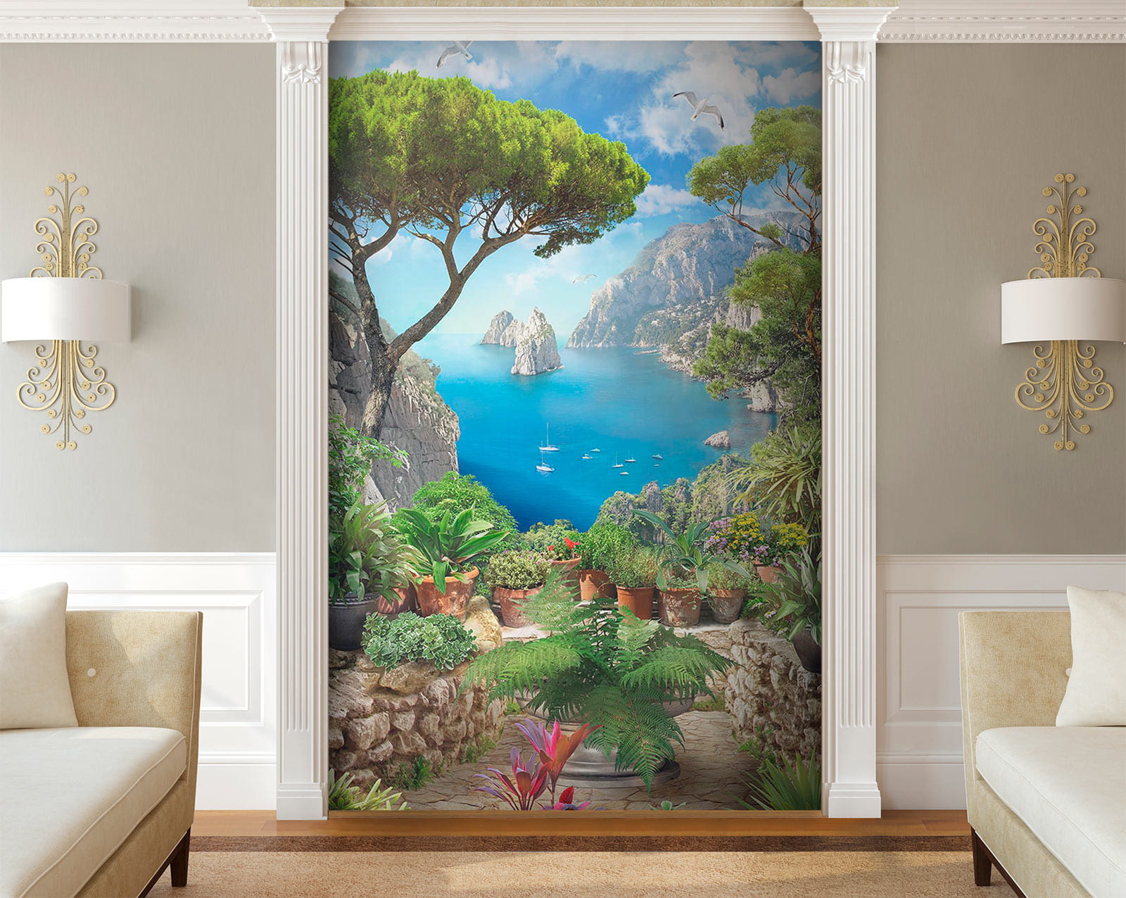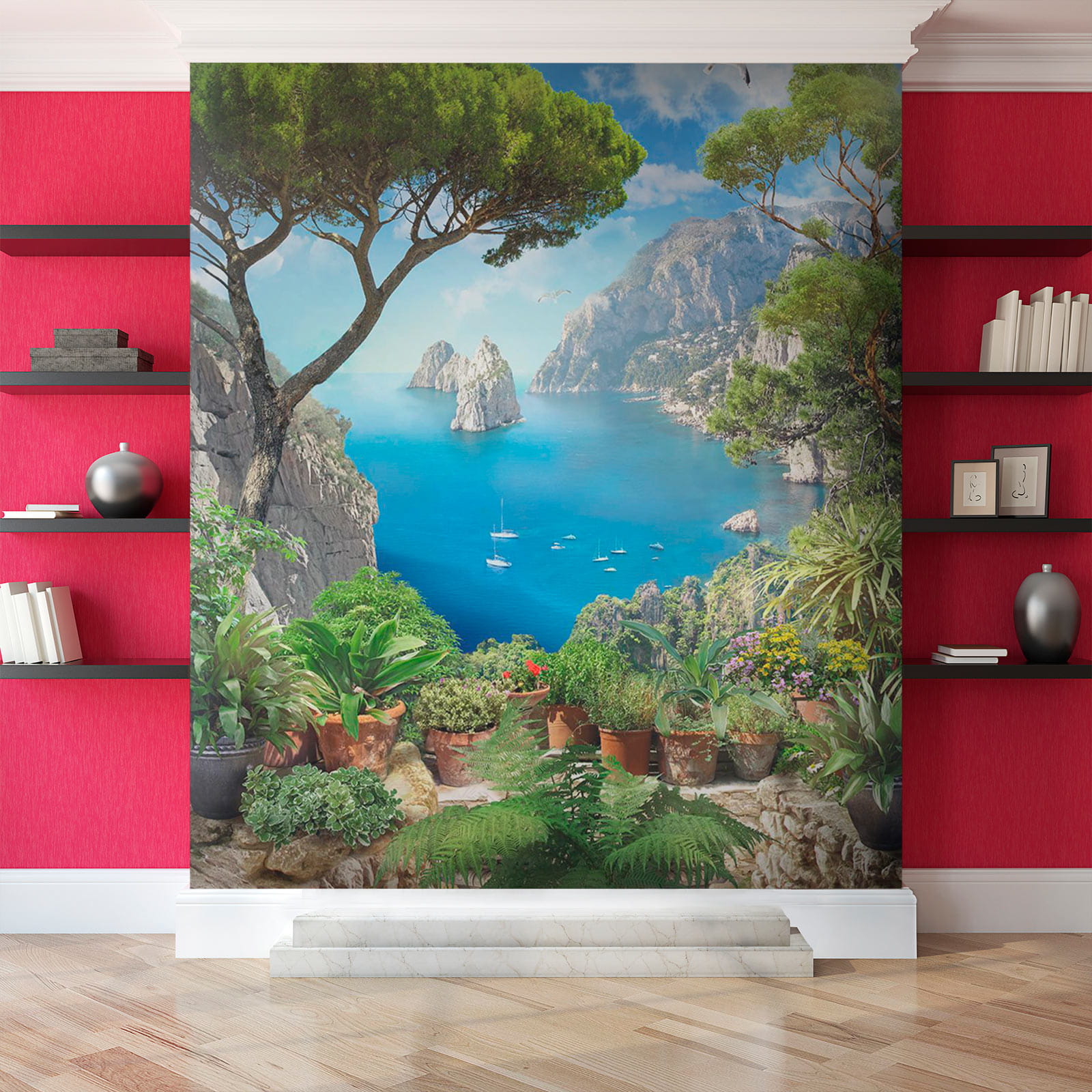 Transform a dull wall into a breathtaking escape with this stunning mural, “View of the Ocean from a Cliff.” Picture yourself sipping coffee while soaking in vibrant blues and lush greens, as if you’re peering over a cliff at the sparkling sea. This mural’s like a mini vacation every day! It captures the beauty of nature with charming potted plants adding that cozy touch. Imagine the birds chirping and that salty breeze wafting in—okay, maybe not, but a girl can dream, right? Perfect for living rooms or cozy nooks, this piece invites daydreams of serene shores and gentle waves.