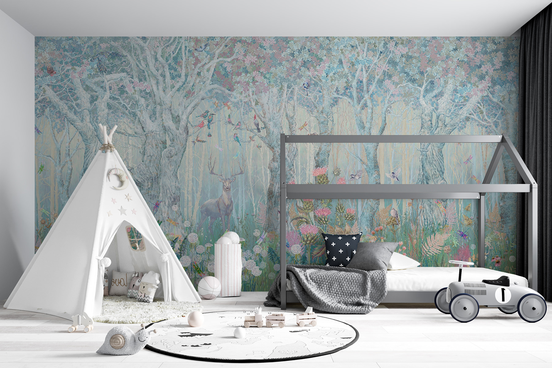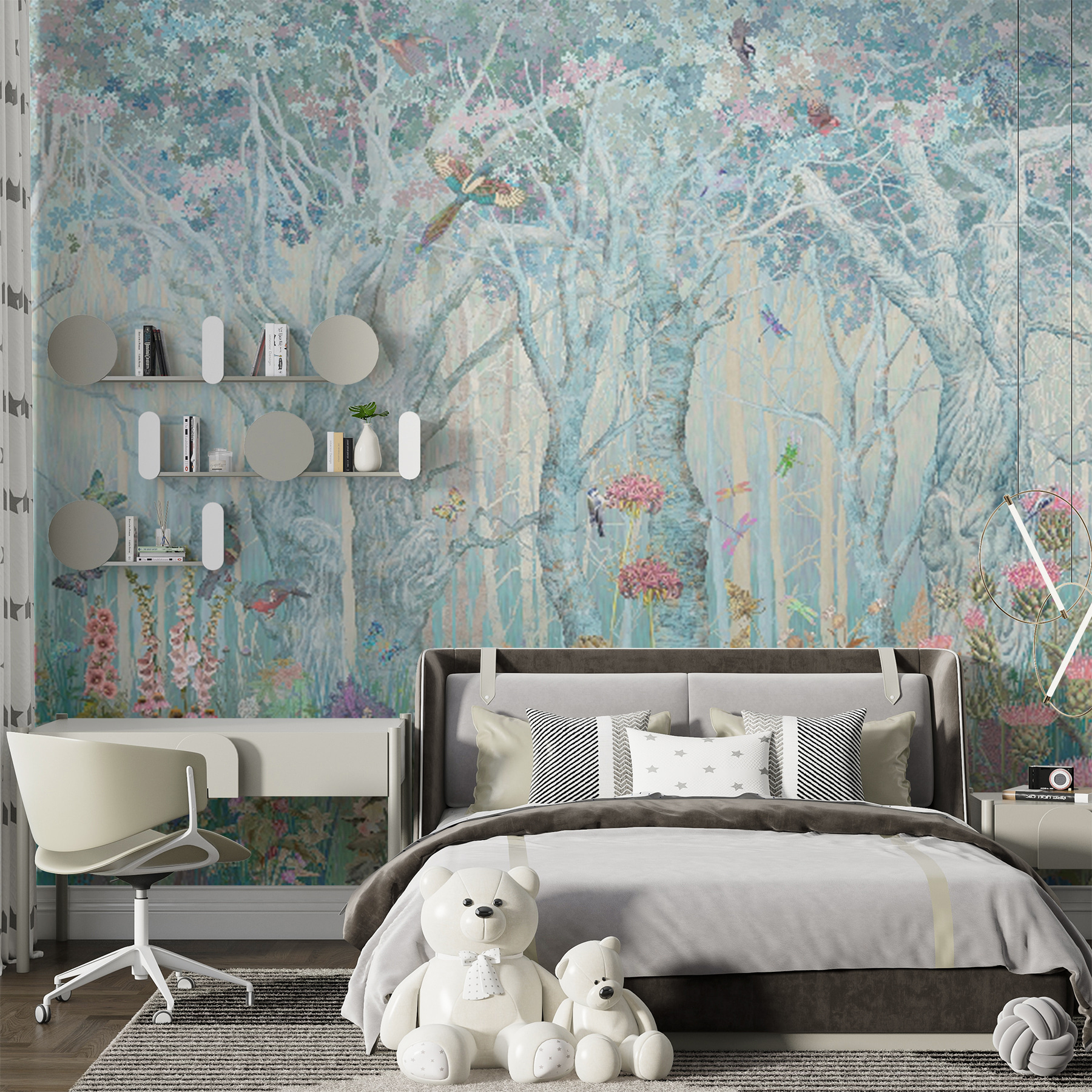 Mergulhe no mural “Enchanted Forest”, onde veados gentis e pássaros caprichosos trazem uma floresta mágica para a sua sala de estar. Imagine-o – uma cena serena que se espalha pela sua parede, com tons pastel suaves e flora detalhada. Perfeito para os amantes da natureza, este mural transforma qualquer espaço num retiro tranquilo. Imagine receber convidados com um cenário tão calmo e bonito – é como entrar num conto de fadas! Quer seja uma sala de estar, um quarto ou até mesmo um recanto de leitura acolhedor, este mural sussurra charme e paz em cada canto. Não se trata apenas de decoração; é uma fuga instantânea para uma floresta tranquila.