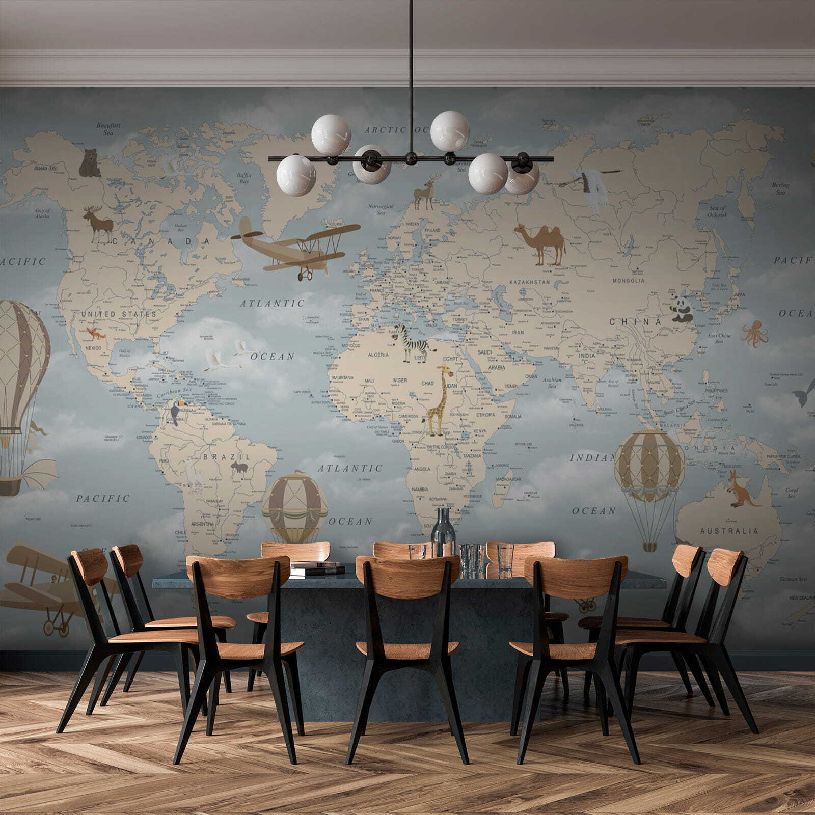 Imagine entrar no quarto de uma criança e ser recebido por um encantador mural de balões de ar quente a flutuar serenamente sobre um mapa-mundo em tons pastel. É como fazer uma viagem à volta do mundo a partir do conforto da sua própria casa. Perfeito para despertar a curiosidade e os devaneios, este mural está repleto de pormenores extravagantes – animais divertidos, aviões antigos e, claro, aqueles balões de ar quente sonhadores que flutuam acima dos oceanos e continentes como se estivessem na sua própria aventura.