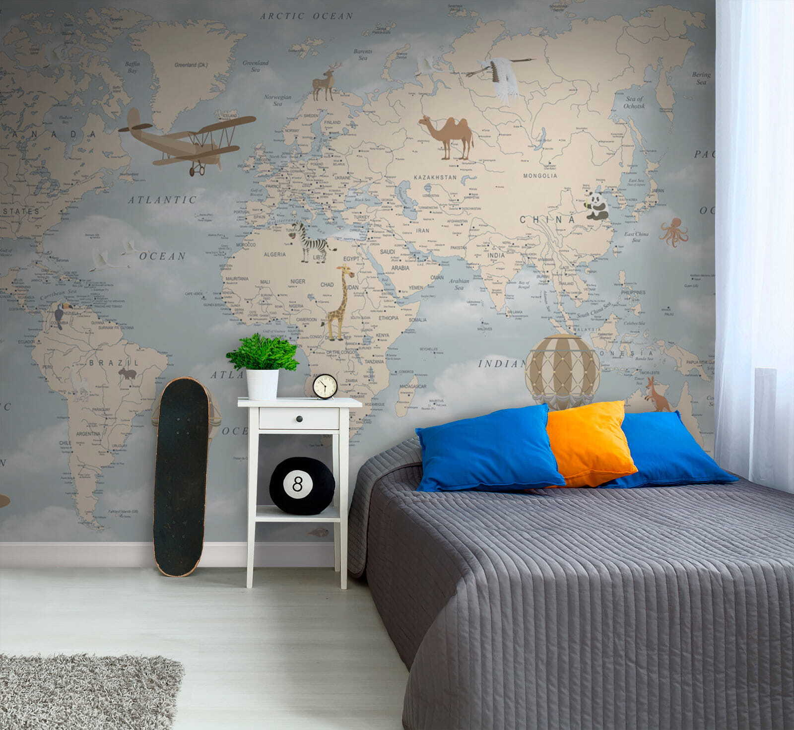 Incorporar este mural no seu espaço não se trata apenas de decoração; trata-se de criar um pano de fundo para histórias e imaginação. Pense no seu filho a traçar os dedos ao longo do mapa, a sonhar com aventuras em terras longínquas ou até a planear viagens futuras. Além disso, não é apenas divertido para as crianças – é um bom início de conversa para qualquer pessoa que entre na sala. Não consegue ver os mais pequenos a apontar onde estão no mapa ou a inventar histórias sobre os animais que vêem?