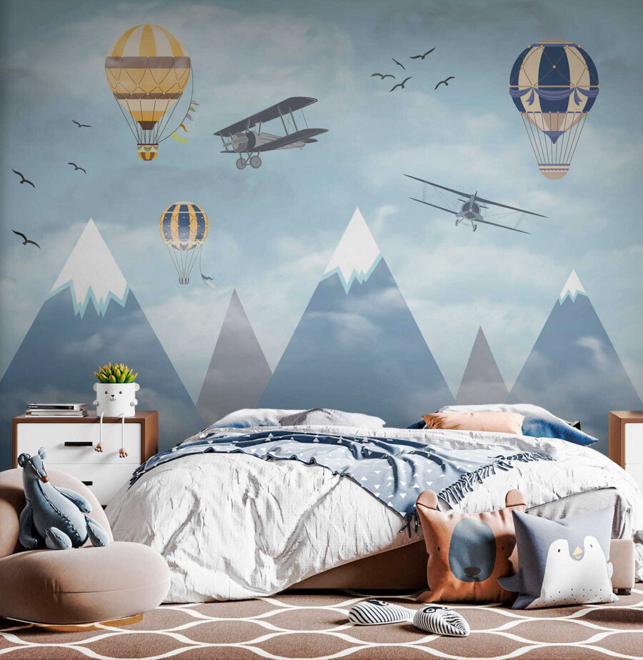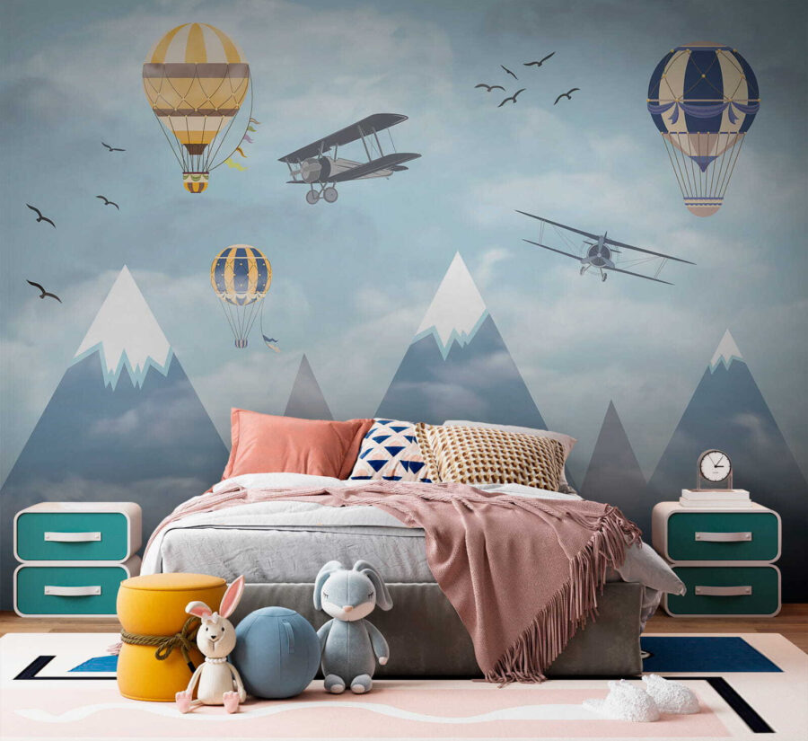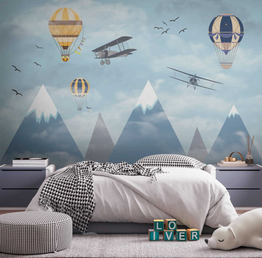 Imagine acordar com um céu cheio de balões de ar quente extravagantes a flutuar entre as nuvens, ao lado de aviões aventureiros a passar e pássaros a voar alto – é pura magia! O mural “Hot Air Balloon in the Sky” traz uma sensação de maravilha e aventura diretamente para o quarto. Perfeito para estimular a criatividade e os sonhos nos espaços das crianças, é como dar-lhes uma tela para a sua imaginação correr solta. Os azuis pastel e as nuvens suaves são tão calmantes, fazendo com que o espaço se sinta leve e arejado. Não se trata apenas de decoração – é uma viagem aos céus sem sequer sair da divisão. Os pais também podem sentir uma pontada de nostalgia, recordando sonhos de lugares longínquos e viagens ousadas. Quem não gostaria de ter um pouco disso em casa? Para além disso, aquelas montanhas cobertas de neve ao fundo? Simplesmente encantadoras. Este mural é basicamente um sonho acordado em forma de arte de parede – infinitamente encantador e maravilhosamente sereno. As crianças vão adorá-lo, assim como a criança que há em si.
