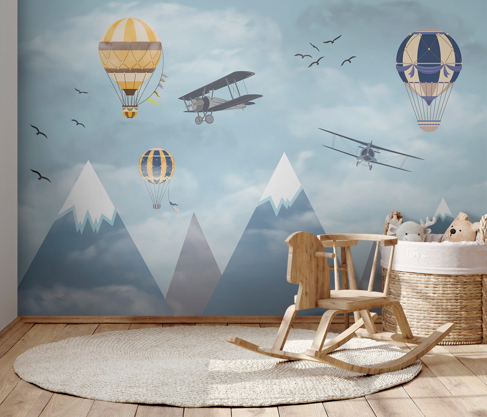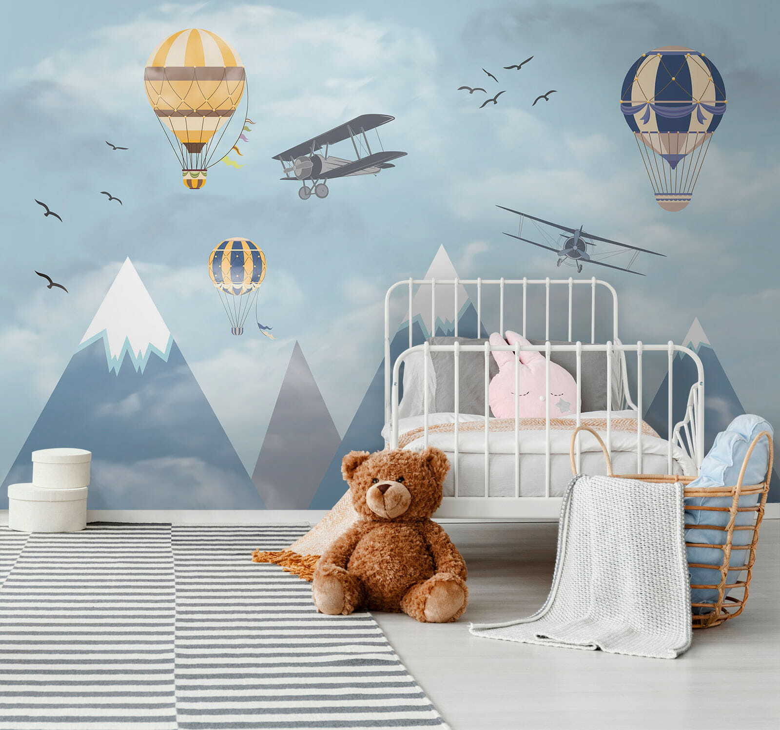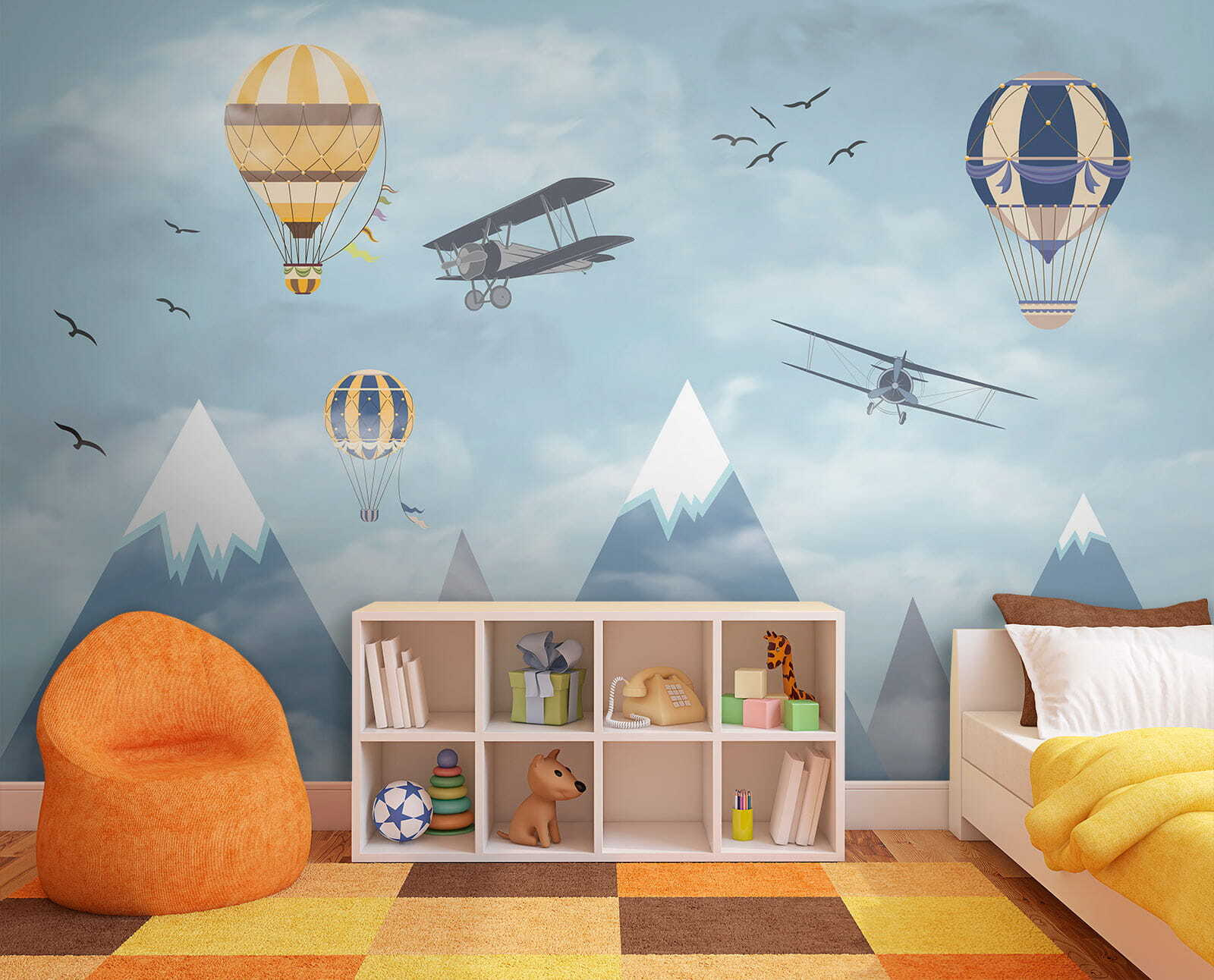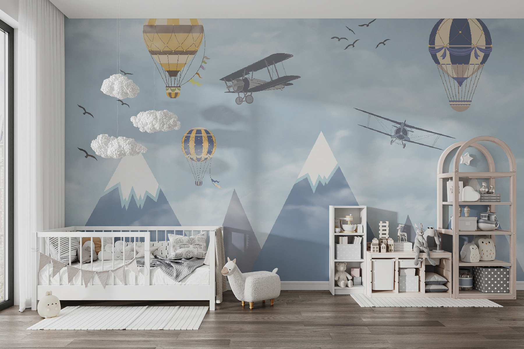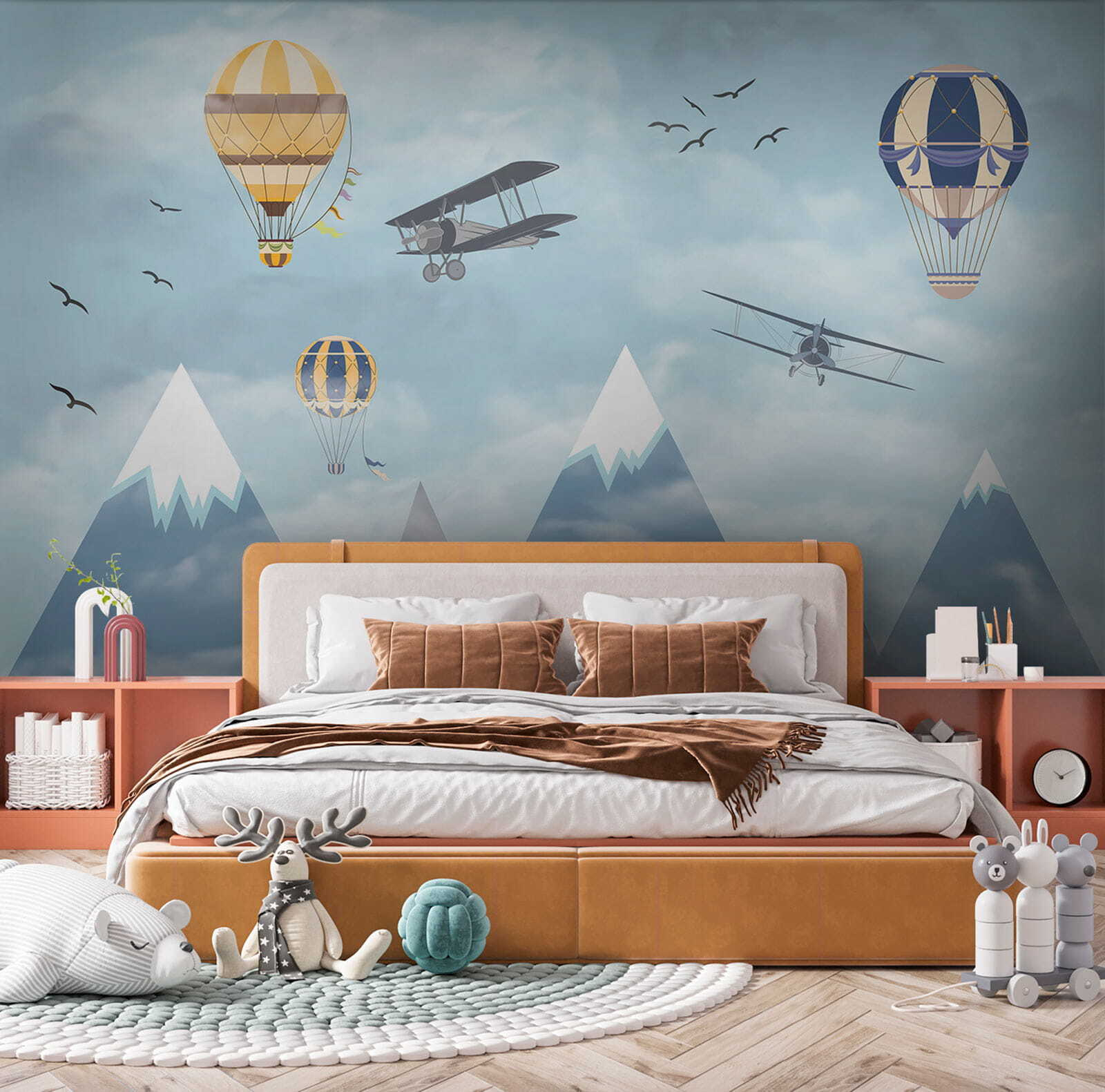Imagine acordar com um céu cheio de balões de ar quente extravagantes a flutuar entre as nuvens, ao lado de aviões aventureiros a passar e pássaros a voar alto – é pura magia! O mural “Hot Air Balloon in the Sky” traz uma sensação de maravilha e aventura diretamente para o quarto. Perfeito para estimular a criatividade e os sonhos nos espaços das crianças, é como dar-lhes uma tela para a sua imaginação correr solta. Os azuis pastel e as nuvens suaves são tão calmantes, fazendo com que o espaço se sinta leve e arejado. Não se trata apenas de decoração – é uma viagem aos céus sem sequer sair da divisão. Os pais também podem sentir uma pontada de nostalgia, recordando sonhos de lugares longínquos e viagens ousadas. Quem não gostaria de ter um pouco disso em casa? Para além disso, aquelas montanhas cobertas de neve ao fundo? Simplesmente encantadoras. Este mural é basicamente um sonho acordado em forma de arte de parede – infinitamente encantador e maravilhosamente sereno. As crianças vão adorá-lo, assim como a criança que há em si.