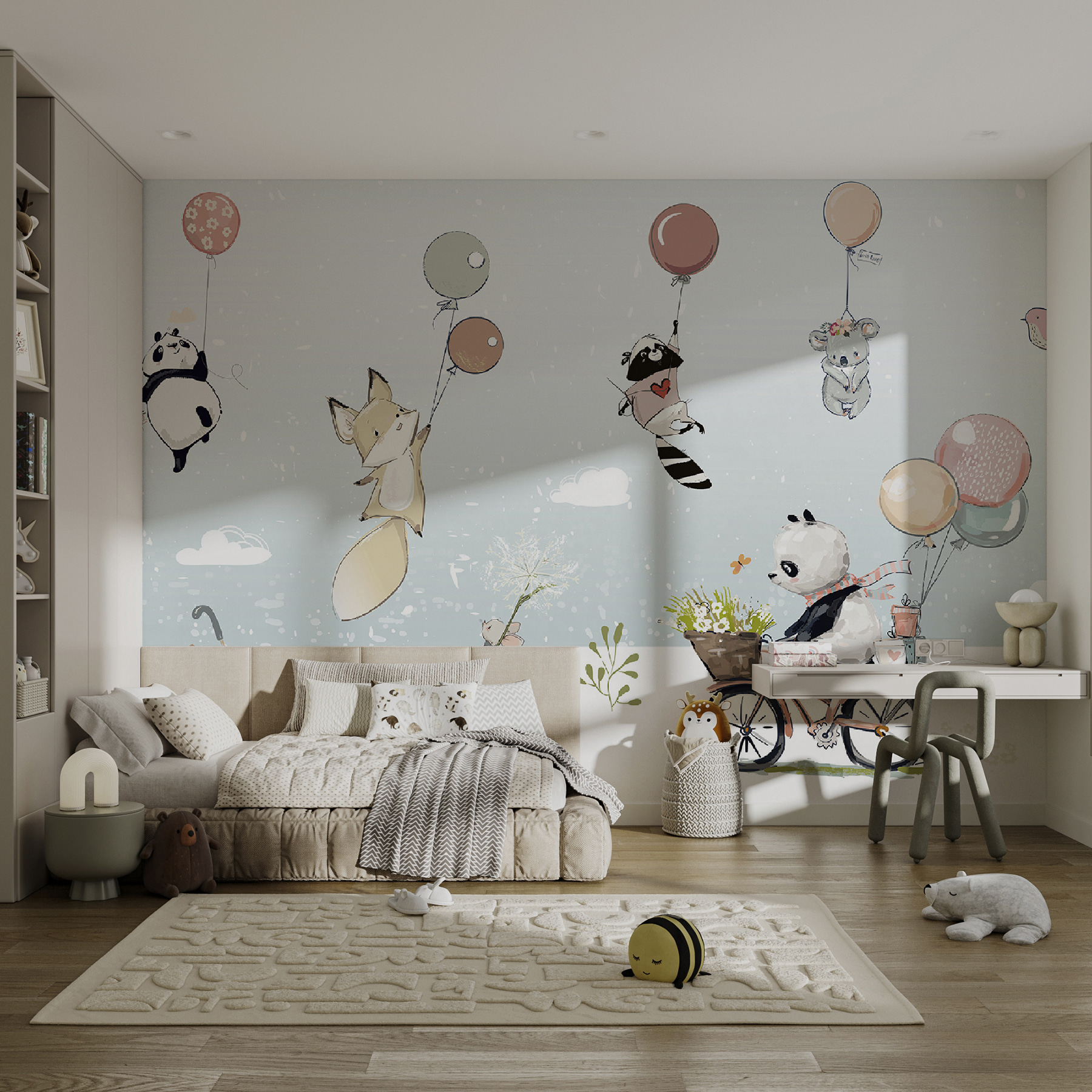 Imagine entrar no quarto do seu filho e ser recebido por uma cena caprichosa de um panda a segurar um cesto de flores – é como entrar num doce devaneio. Este mural de parede encantador é perfeito para infantários ou qualquer espaço onde queira um toque de encanto lúdico. A aparência macia e fofa do panda, combinada com balões coloridos e uma bicicleta, é sinónimo de diversão e aventura. Imagine-se a contar histórias de embalar inspiradas por estas personagens encantadoras. Não se trata apenas de decoração; é um teatro para a imaginação, trazendo sorrisos e um pouco de magia aos momentos do dia a dia.