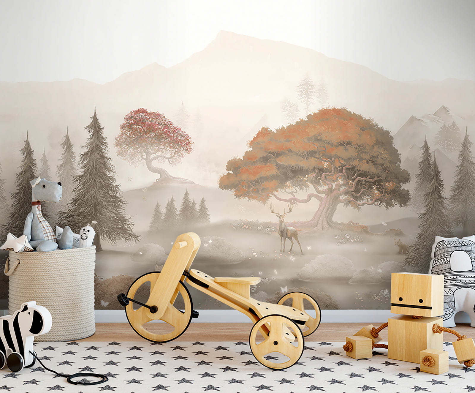 Imagine entrar numa floresta de sonho sem sair da sua sala de estar. Este mural de parede, com os seus tons suaves de árvores e montanhas distantes, transporta-o para um mundo sereno onde a natureza reina. Imagine uma tarde preguiçosa, a saborear um café enquanto borboletas voam à sua volta e veados pastam tranquilamente. É como ter uma mini escapadela todos os dias! As cores vibrantes, especialmente aquela árvore vermelha impressionante, destacam-se contra o fundo enevoado, criando uma atmosfera acolhedora. Transforma qualquer espaço num santuário. Por isso, vá em frente, deixe as suas paredes contarem uma história de tranquilidade. Não seria simplesmente encantador?
