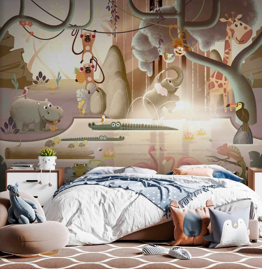 Imagine isto na parede do seu filho: uma cena extravagante diretamente de um livro de histórias! Este mural de parede apresenta uma rã atrevida sentada num prato, misturando-se com um cenário lúdico da selva. Elefantes, macacos e flamingos – estão todos aqui para cativar a imaginação dos mais pequenos. É como se fosse uma mini-aventura mesmo no quarto, criando um local divertido para contar histórias ou apenas sonhar acordado!