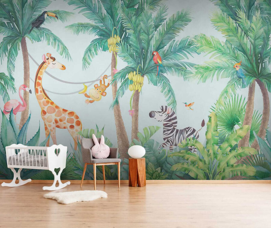 Ilumine o quarto do seu filho com este encantador “Fotomurais Animais Tropicais Apreciando as Vibrações da Selva!” Imagine esta cena: macacos atrevidos a baloiçarem-se nas videiras, uma girafa amigável e uma zebra com um ar super descontraído – tudo rodeado por palmeiras verdes e exuberantes. É como ter um mini safari na selva mesmo em casa! Perfeito para fomentar o amor pela natureza e pelos animais nos pequenos exploradores. E, sinceramente, quem é que não gostaria de acordar com um flamingo a dizer olá todas as manhãs? Este mural traz uma explosão de alegria e aventura, fazendo com que qualquer espaço se sinta vivo e feliz.