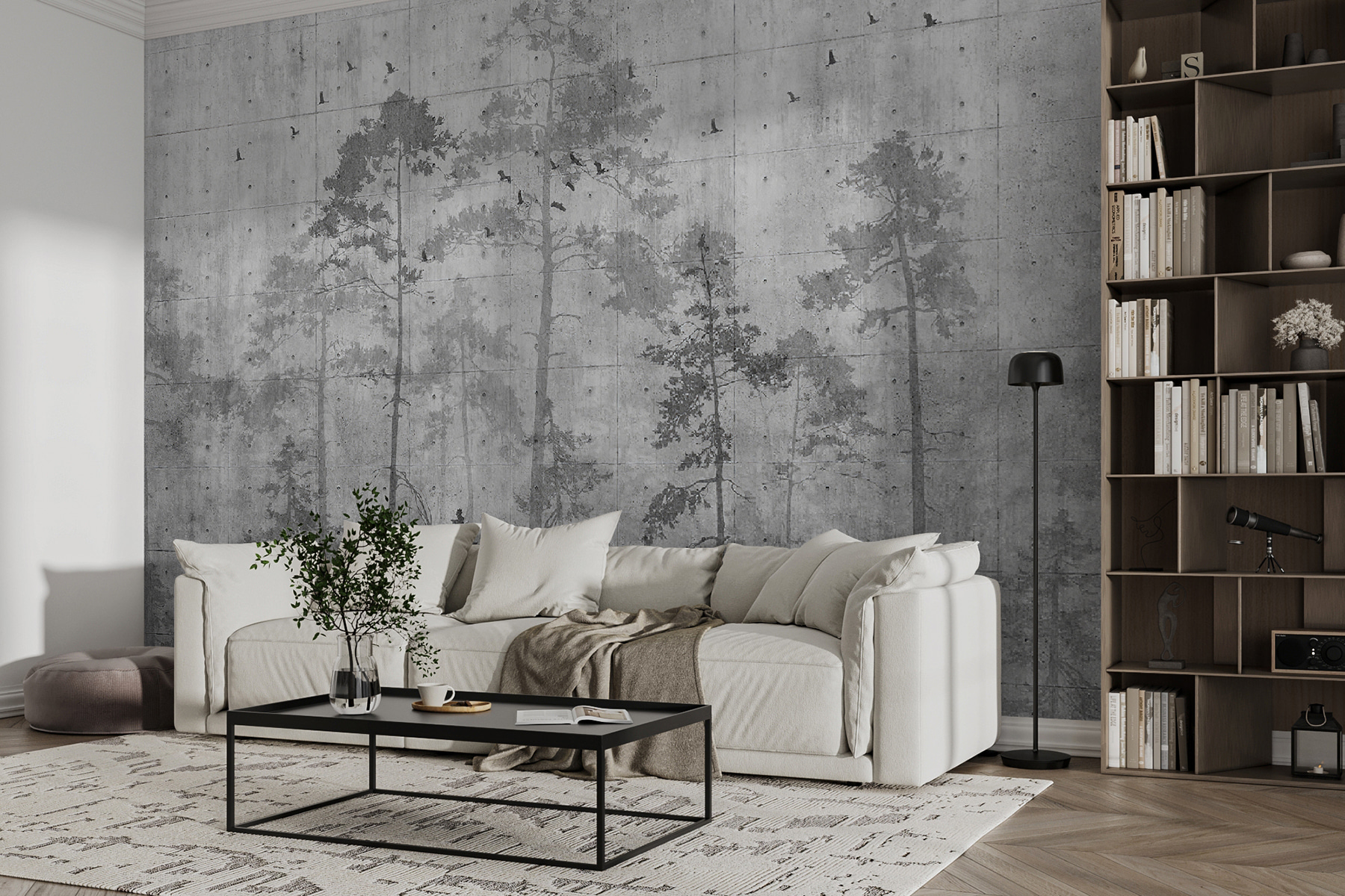 Sempre quis um toque de natureza sem a manutenção? Este mural “Sombra de Árvore numa Parede de Betão” traz a calma de uma floresta diretamente para o seu espaço. Pense nele como um passeio sereno na floresta, sem o repelente de insectos. As árvores suaves e sombrias contra o fundo de betão têm uma sensação quase de aguarela, como uma manhã de sonho e neblina capturada só para si.