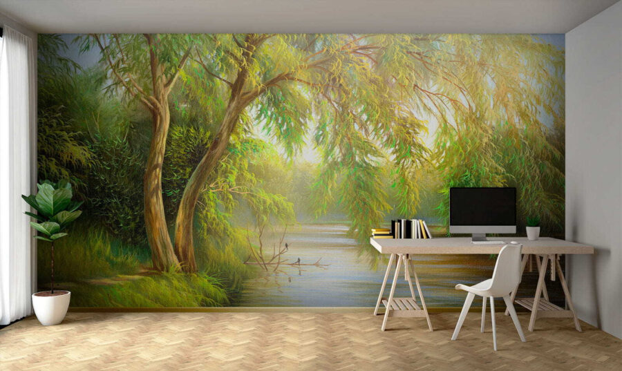 Transforme o seu espaço com um mural que o fará sentir como se tivesse entrado na natureza. Este design encantador mostra uma árvore serena adornada com folhas verdes exuberantes e amarelas quentes, captando na perfeição o brilho da hora dourada. Imagine-se a relaxar na sua sala de estar, a beber chá, enquanto este mural sussurra histórias do grande ar livre. É como ter uma mini-floresta mesmo na sua parede, trazendo toda essa vibração refrescante sem quaisquer insectos! Quer se trate de um recanto acolhedor ou de um escritório luminoso, esta peça convida à calma e à inspiração. Não se surpreenda se lhe der vontade de começar um jardim!