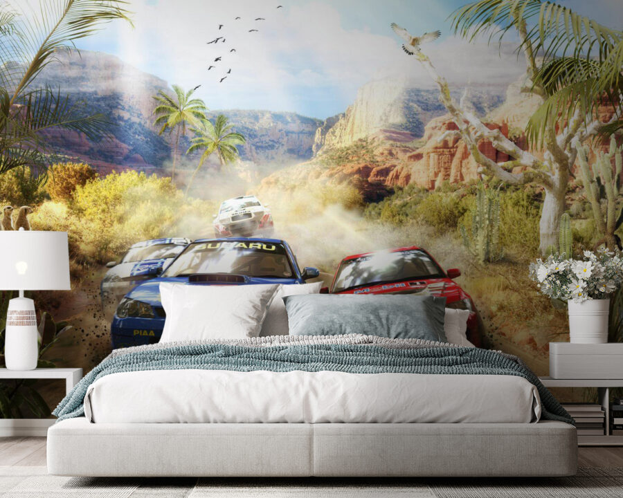 Imagine entrar no quarto do seu filho e ser levado para uma aventura no deserto, com carros de rali a levantar poeira enquanto passam por desfiladeiros escarpados e cactos saguaro. Este mural não é apenas uma mancha de cor – é como abrir uma janela para uma corrida emocionante. As crianças vão sentir a adrenalina da excitação ao imaginarem-se ao volante, navegando por aquelas curvas e contracurvas. Não se trata apenas de carros – trata-se da liberdade selvagem do deserto, da camaradagem de uma corrida e da pura alegria da velocidade. Perfeito para os pequenos aventureiros ou entusiastas das corridas, este jogo vai despertar a imaginação e talvez até provocar alguns ruídos de “vroom vroom”! E não é só para crianças – os adultos também podem dar por si a sonhar acordados com os caminhos sinuosos do deserto.