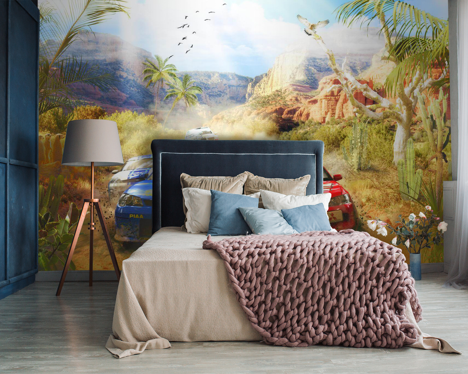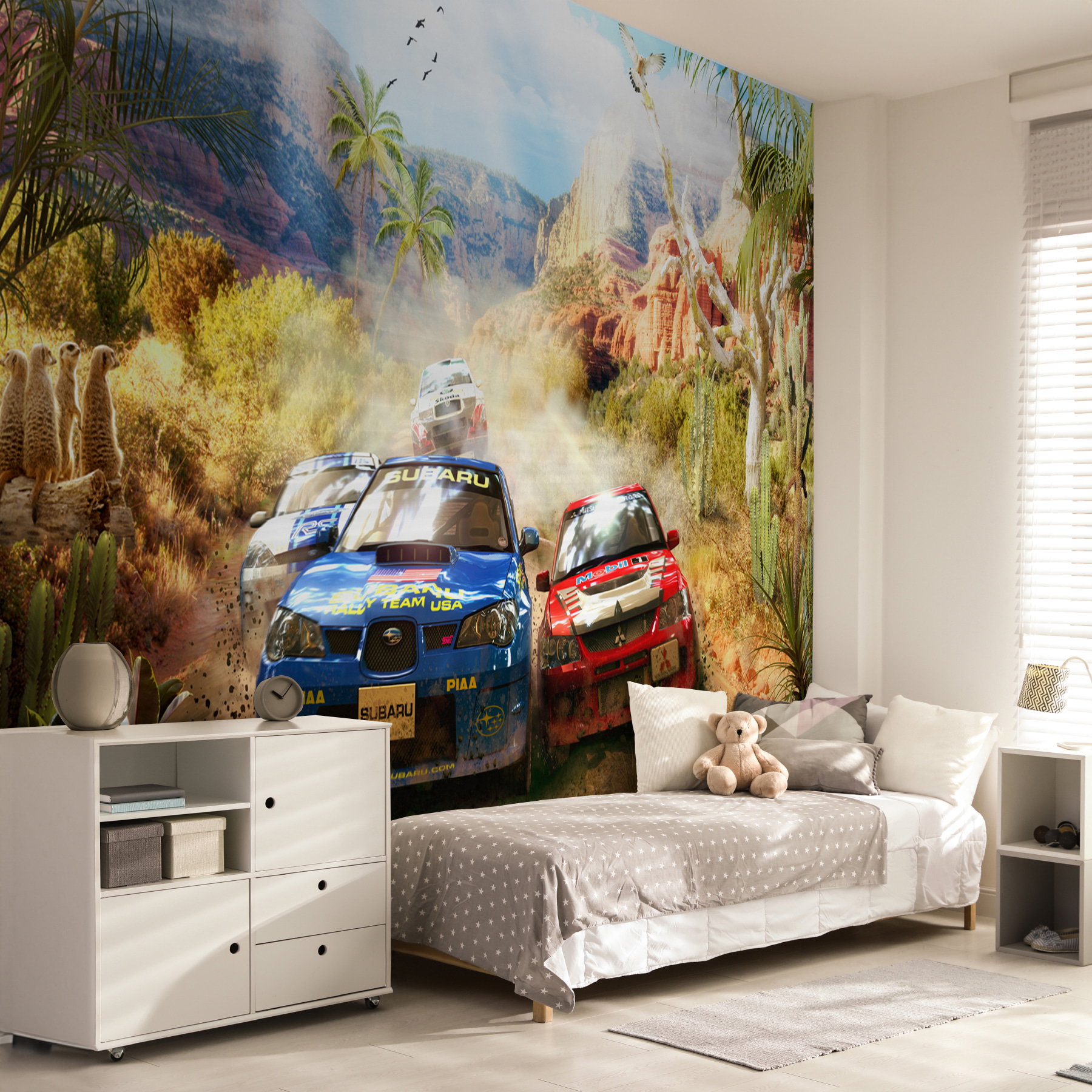 Imagine entrar no quarto do seu filho e ser levado para uma aventura no deserto, com carros de rali a levantar poeira enquanto passam por desfiladeiros escarpados e cactos saguaro. Este mural não é apenas uma mancha de cor – é como abrir uma janela para uma corrida emocionante. As crianças vão sentir a adrenalina da excitação ao imaginarem-se ao volante, navegando por aquelas curvas e contracurvas. Não se trata apenas de carros – trata-se da liberdade selvagem do deserto, da camaradagem de uma corrida e da pura alegria da velocidade. Perfeito para os pequenos aventureiros ou entusiastas das corridas, este jogo vai despertar a imaginação e talvez até provocar alguns ruídos de “vroom vroom”! E não é só para crianças – os adultos também podem dar por si a sonhar acordados com os caminhos sinuosos do deserto.