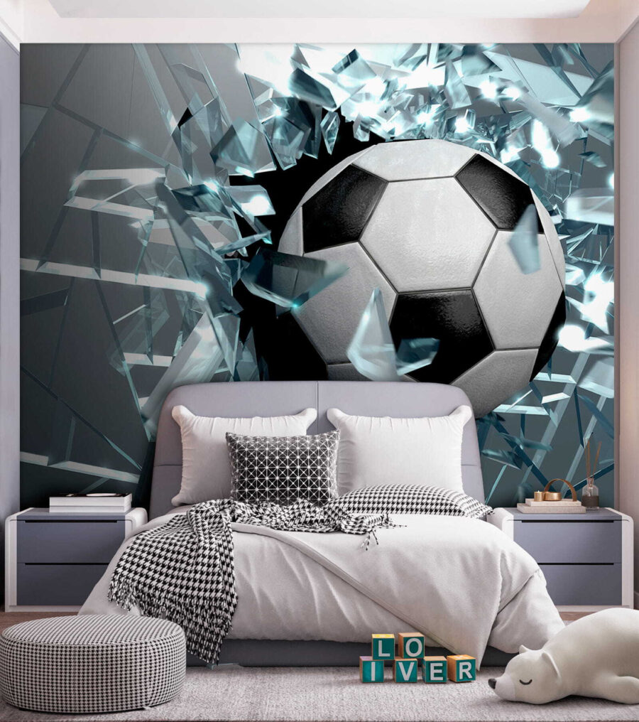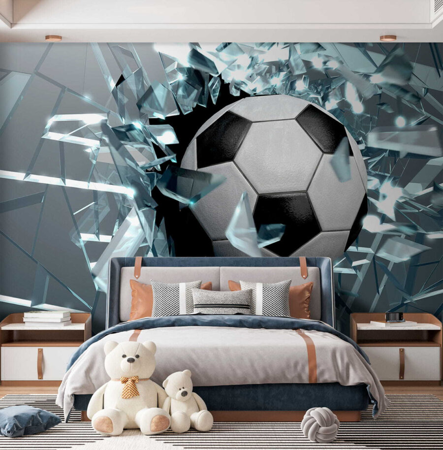 Transformando uma divisão numa aventura vibrante, este mural traz a energia emocionante do futebol diretamente para a sua parede. Imagine uma bola de futebol forte a irromper através de uma barreira imaginária, com cacos de vidro a provocar uma vibração animada. É como se o seu espaço tivesse acabado de marcar o derradeiro golo, tornando-o perfeito para crianças que sonham em tornar-se superestrelas no campo. Imagine só: os amigos aparecem, os olhos arregalam-se e as perguntas voam. Que miúdo não se sentiria um campeão com este cenário dinâmico? É mais do que uma simples decoração; é inspiração, entusiasmo e muita diversão!