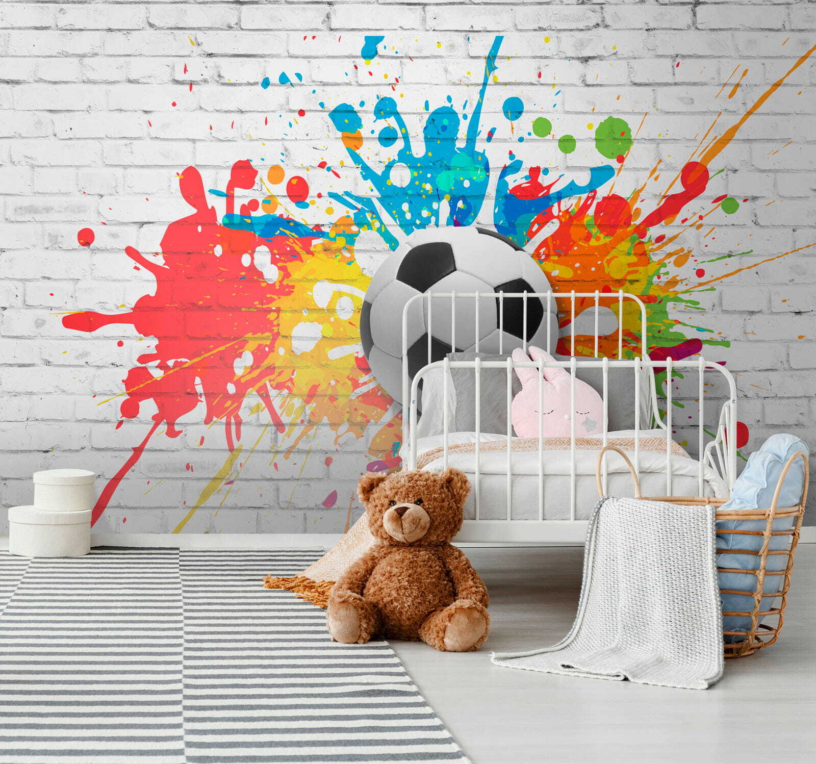 Imagine isto – uma explosão de cores vivas contra uma parede de tijolo branco e, mesmo no meio, uma bola de futebol clássica a preto e branco. É como se alguém tivesse pegado no golo mais emocionante do mundo e o tivesse congelado na sua sala de estar. Perfeito para um quarto de criança, este mural tem toda a energia de uma multidão de estádio numa única parede. Os tons arrojados sobressaem contra a bola monocromática, criando um contraste que é simultaneamente lúdico e marcante. É a magia 3D que dá vida ao jogo! Imagine o entusiasmo no rosto do seu filho quando entra e vê isto – um cenário diário para os seus sonhos de marcar o golo da vitória. Quer estejam a jogar ou apenas a passear, este mural cria o cenário perfeito.