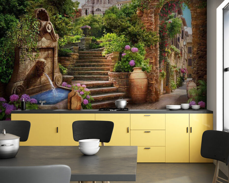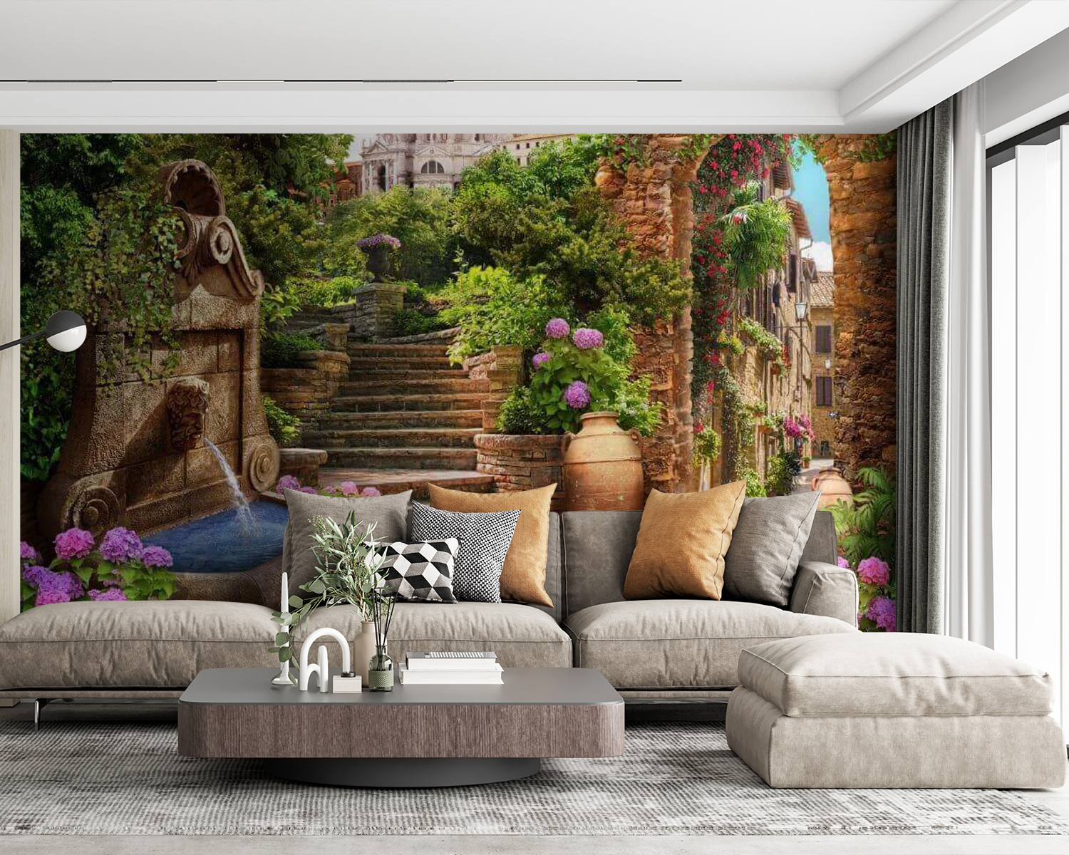 Transforme qualquer espaço numa fuga de sonho com este mural de parede encantador que apresenta um caminho de pedra sereno, uma fonte borbulhante e flores vibrantes. Imagine-se a entrar num refúgio europeu acolhedor a partir da sua sala de estar ou do seu quarto. Os sons suaves da água fá-lo-ão quase ouvir ondulações suaves, enquanto as flores coloridas dão um toque de alegria ao cenário. É como encontrar aquele canto escondido de uma aldeia pitoresca, apenas à espera de inspirar a sua próxima aventura. Perfeito para um toque de charme, convida a sonhar acordado a cada olhar. Quem não gostaria de beber café junto a esta fonte? É calor e capricho, reunidos numa peça encantadora.