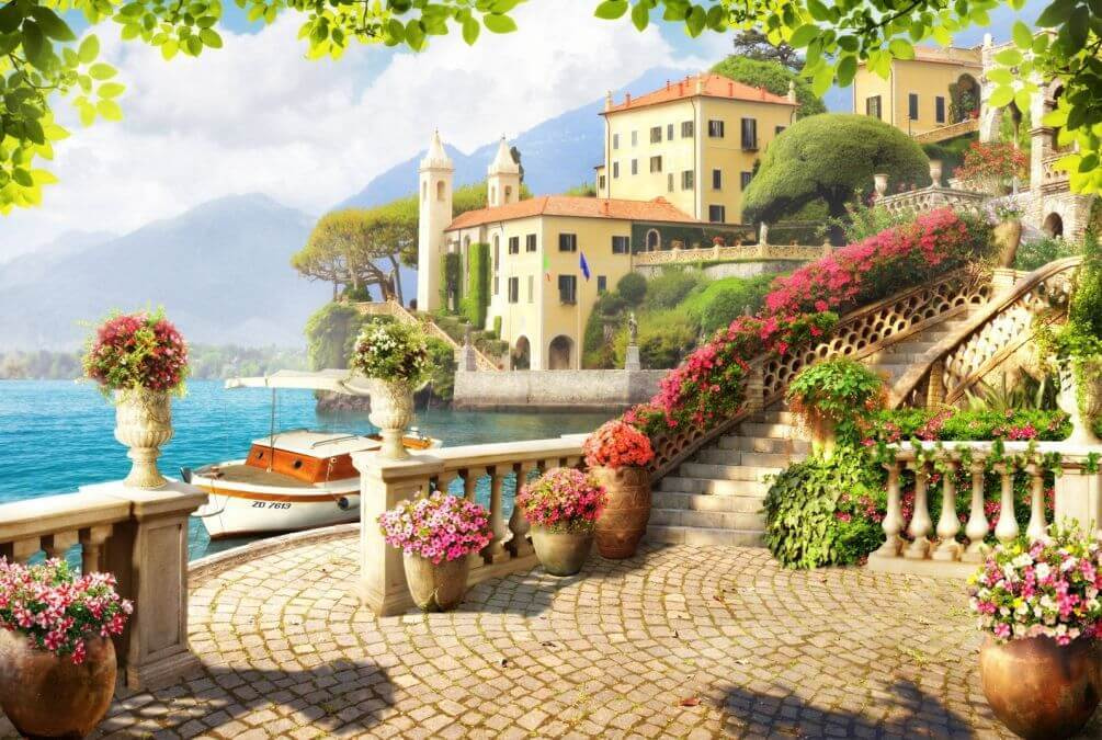 As cores são super vivas – aqueles rosas vibrantes contra os azuis suaves da água. É como uma explosão de alegria. Imagine-se, com um café na mão, a absorver a tranquilidade. Talvez até com um bom livro. Este mural enquadra-se perfeitamente nas vibrações da decoração moderna, mas também tem aquele toque clássico e intemporal. Parece uma atualização instantânea, certo? Além disso, esses caminhos de pedra e a arquitetura detalhada trazem um pouco de estilo europeu a qualquer espaço. Os seus convidados vão pensar que transformou a sua casa num hotel boutique. Quem é que não quereria isso?