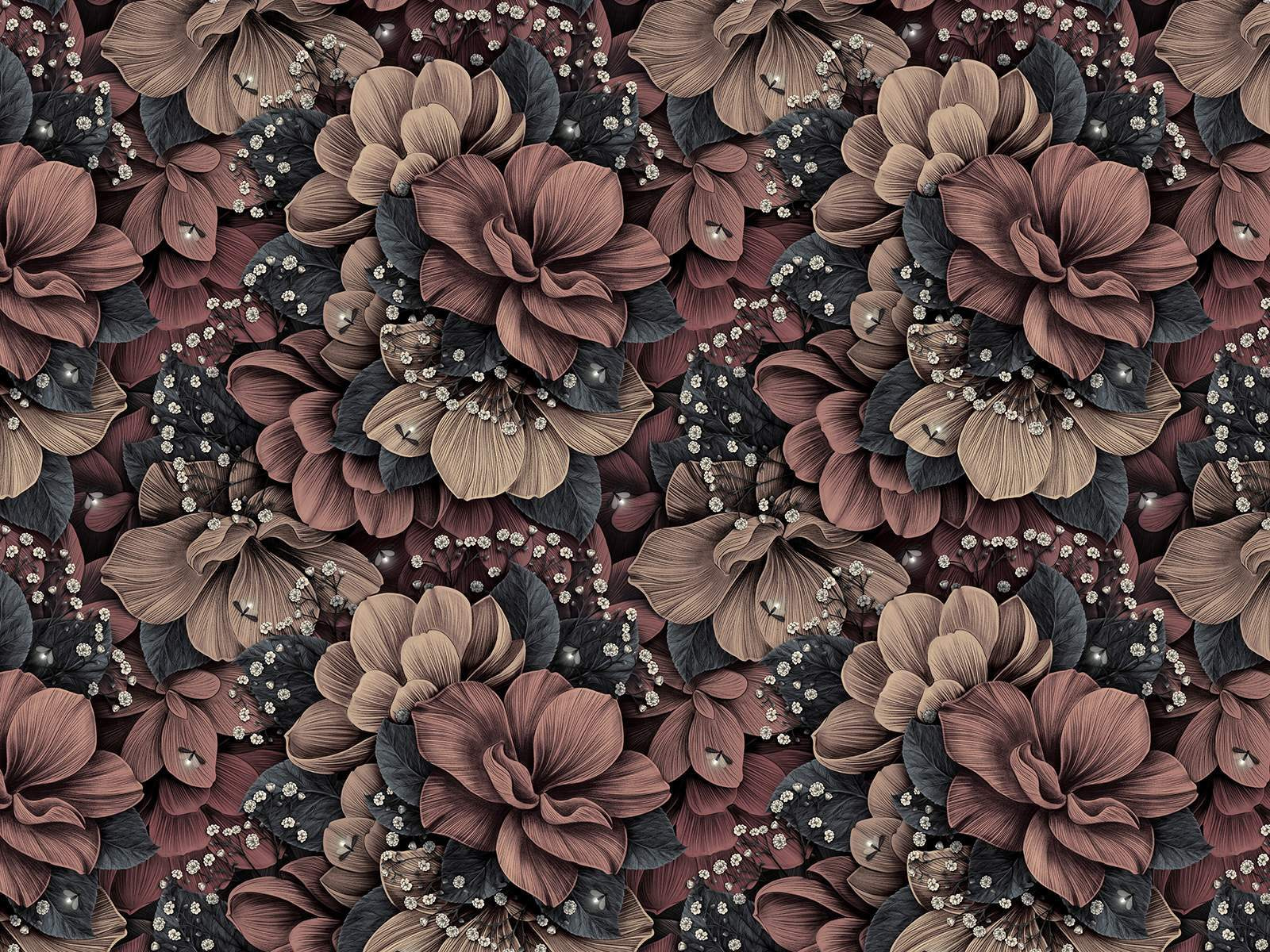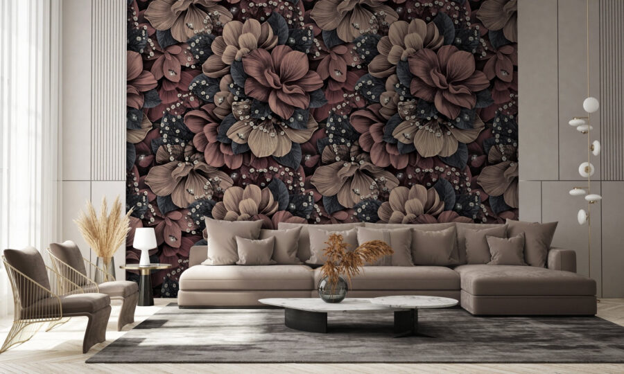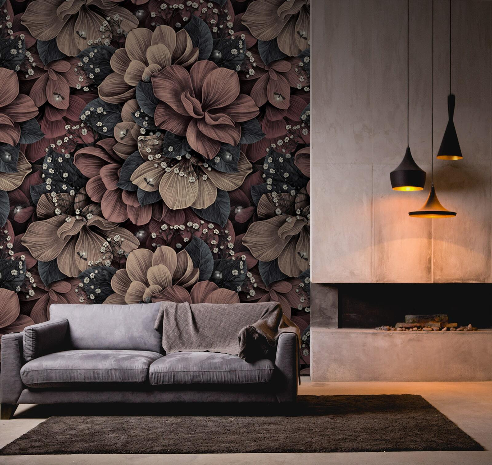 Imagine isto na sua sala de estar: um padrão floral elegantemente detalhado que dá vontade de ficar a olhar para ele o dia todo. Este mural tem um design quente e intrincado que quase parece vivo. As cores ricas misturam-se lindamente, criando uma sensação de profundidade que o atrai. É como ter um jardim exuberante mesmo na sua parede, sem a necessidade de regar.