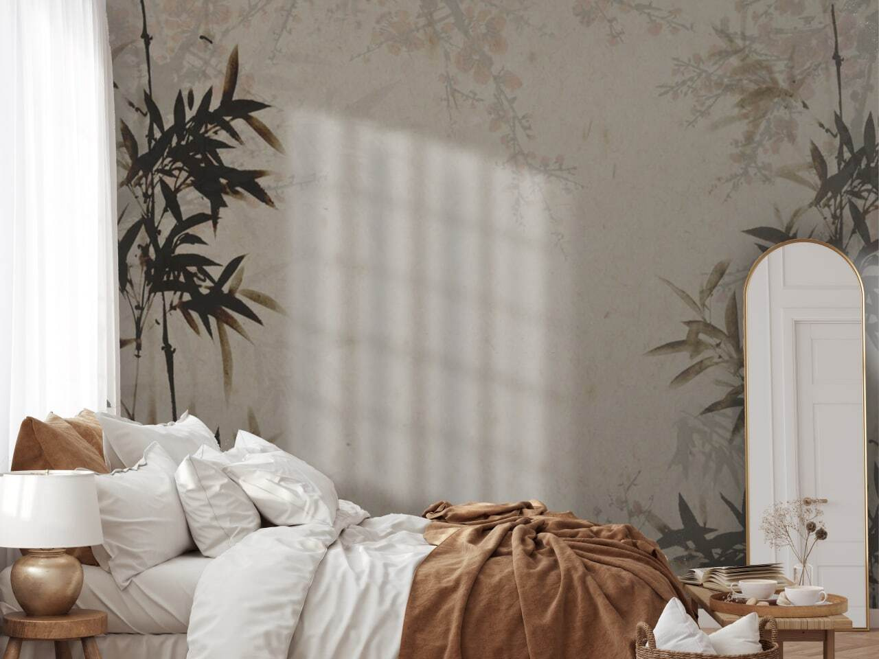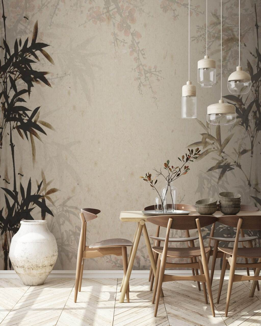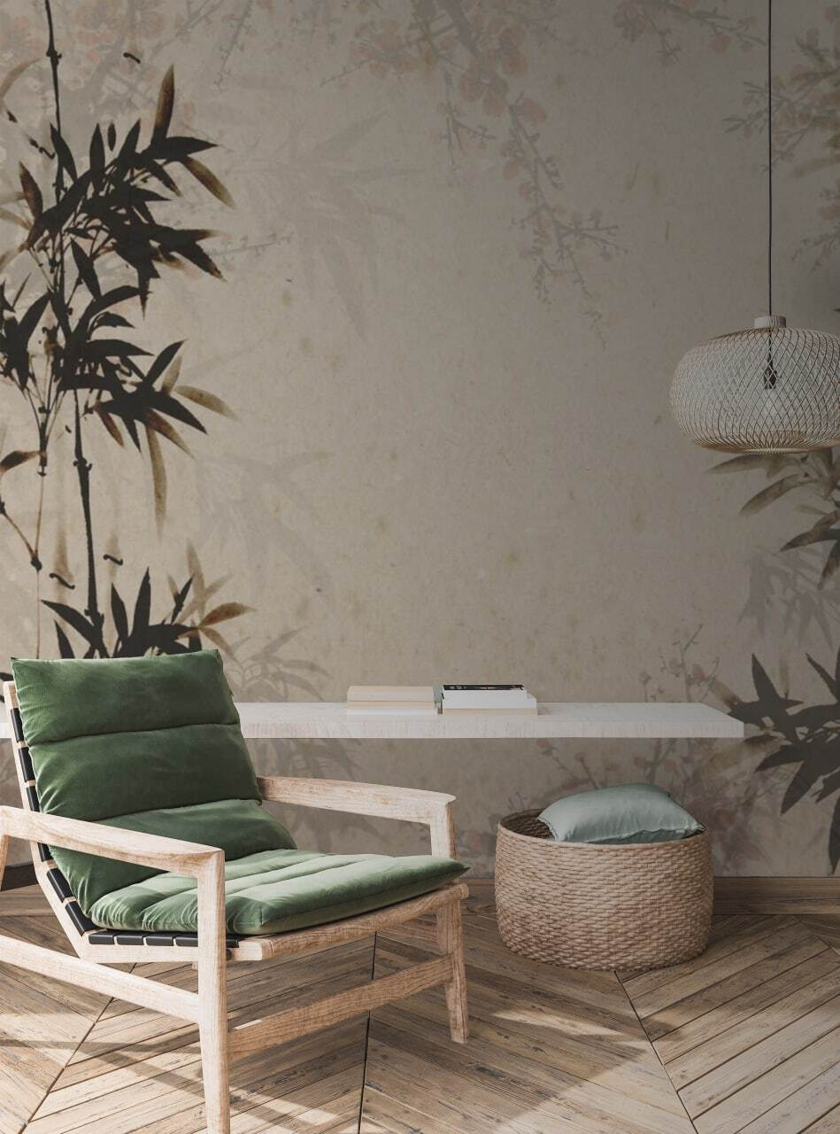Tem uma parede em branco que está a implorar por alguma personalidade? Imagine olhar para este mural “Silhueta de bambu elegante em pergaminho”. É como entrar num jardim zen – sem ter de andar a apanhar relva! Os caules de bambu escuros lançam as suas sombras intemporais sobre um fundo suave tipo pergaminho, criando uma vibração que é simultaneamente calmante e intrigantemente artística.