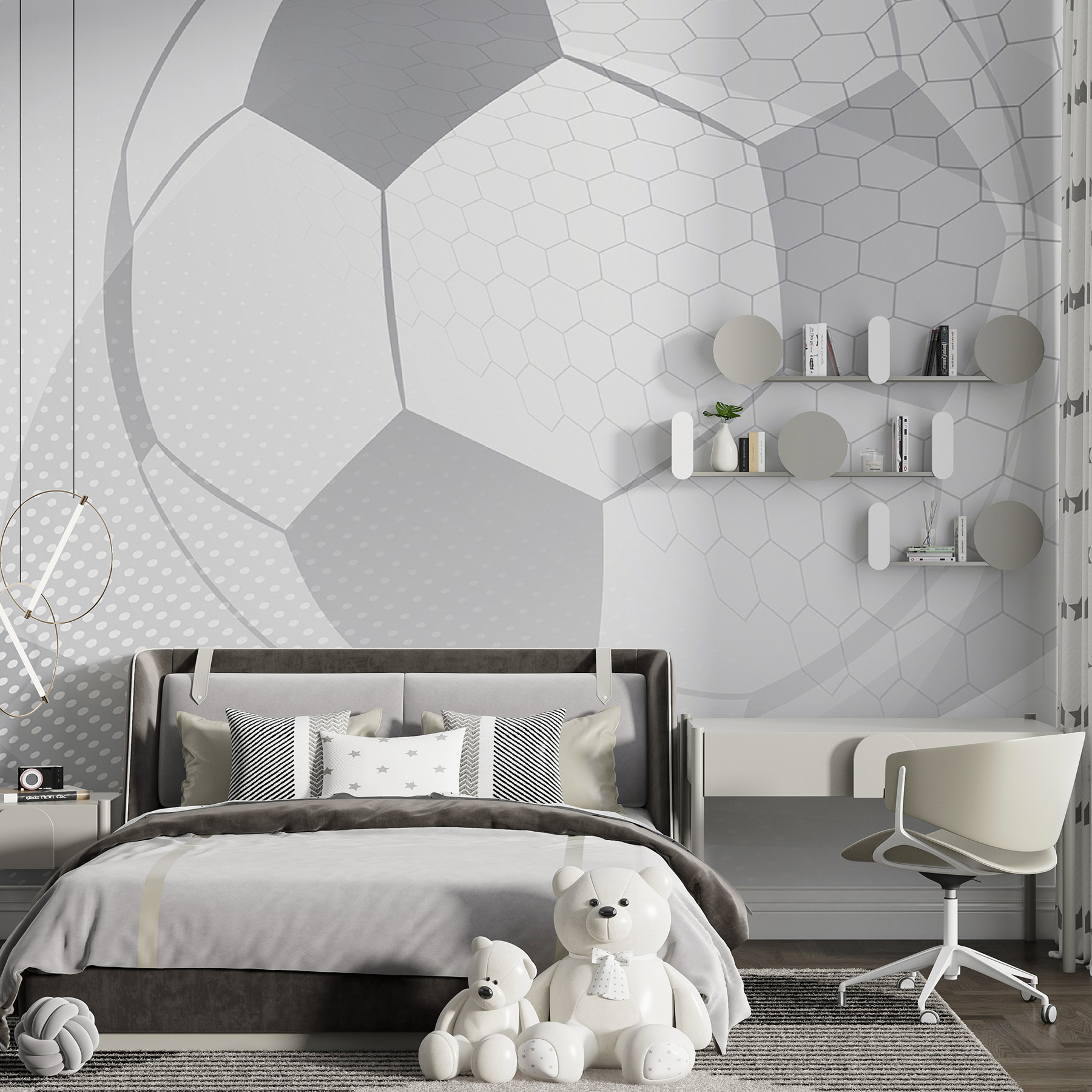 Transforme qualquer espaço no sonho de um amante de futebol com este mural geométrico em tons de cinzento. Imagine as crianças a darem ideias enquanto estão rodeadas por um design lúdico que desperta a sua imaginação. Perfeito para uma sala de jogos ou um quarto, este mural dá um toque moderno às vibrações clássicas do futebol. Os padrões e formas fixes atraem a atenção, criando uma atmosfera dinâmica que desperta entusiasmo e diversão. É como celebrar um golo todos os dias – sem a confusão dos aperitivos! Prepare-se para aplaudir a criatividade, uma parede de cada vez.