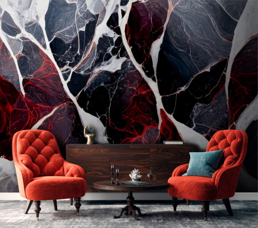 Já pensou que a sua parede poderia ser mais do que apenas, sabe, uma parede? Deixe-me apresentar-lhe esta obra-prima vermelha e preta. É como ter uma obra de arte abstrata na sua sala de estar, só que não precisa de ser elegante. Este mural mistura pretos profundos, cinzentos esfumados e vermelhos ardentes de uma forma que grita “Sou muito mais fixe do que uma parede pintada”. Imagine o seguinte: chega a casa depois de um longo dia e, em vez de um bege aborrecido, é recebido por este design arrojado que o energiza e conforta ao mesmo tempo. Tem aquele toque dramático do mármore sem o toque frio – perfeito para cantos acolhedores ou para aquela parede que precisa de um pouco mais… de energia. Transforme o seu espaço numa galeria, ou apenas num local onde as conversas começam por si próprias. Vá em frente, perca-se nas suas profundezas!