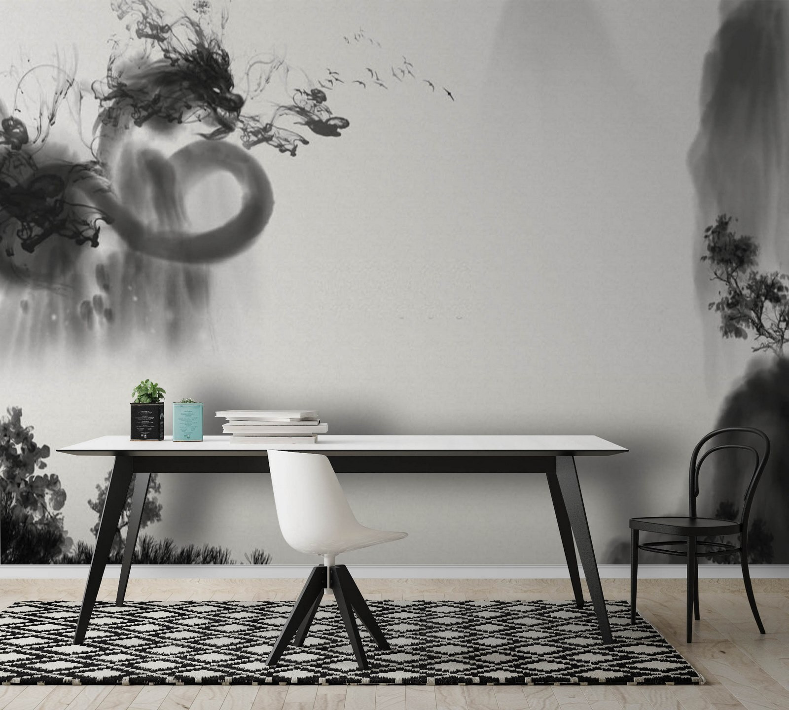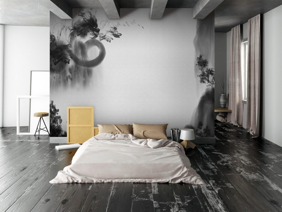 Veja este mural de parede fixe em preto e branco! É uma espécie de mistura de clássico e artístico. Imagine entrar numa sala e ser recebido por esta cena misteriosa, quase sonhadora. Tem este aspeto que o faz pensar em tinta esfumada a rodar no papel, com sugestões de paisagens e formas abstractas que se misturam.