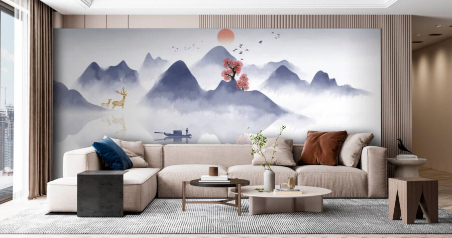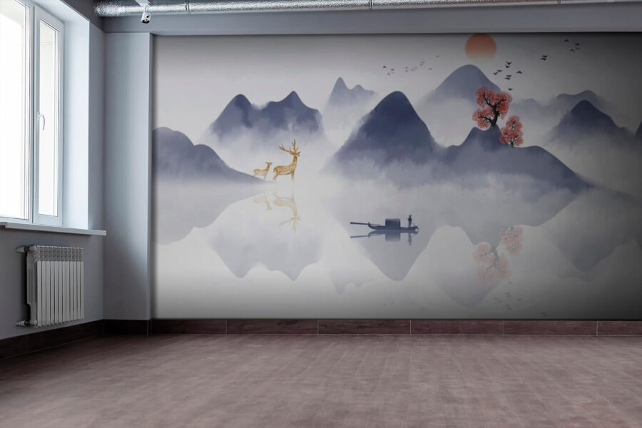 Transforme qualquer divisão num refúgio sereno com este impressionante mural de parede. Apresentando um barco tranquilo a deslizar por uma floresta enevoada, rodeado por montanhas majestosas e árvores vibrantes, convida-o a sonhar acordado. Imagine-se a beber café enquanto o sol da manhã aparece no horizonte, projetando tons suaves na água. É como uma mini-férias cada vez que passa por ali. Perfeito para aqueles recantos acolhedores ou para um escritório que precisa de um pouco de zen. Além disso, há um veado — porque quem não gostaria de observar a vida selvagem sem sair de casa? Abrace esse encanto natural!
