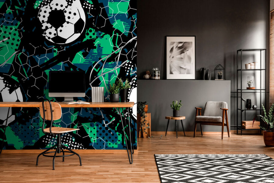 Olá! Quer dar um toque especial ao seu espaço com algo um pouco mais ousado? Veja este mural “Abstract Soccer Pattern with Hexagons” – tem a mistura perfeita de arte e desporto. Os padrões geométricos loucos e as estampas de futebol arrojadas trazem muita energia a qualquer divisão.