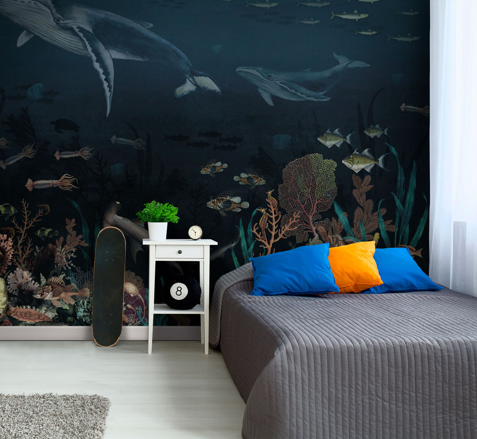 Mergulhe num mundo de maravilhas com este cativante mural de parede de baleias a deslizar graciosamente pelas profundezas! Imagine – está a entrar na sala e, pimba, lá está uma baleia majestosa a nadar ao lado de peixes coloridos, tartarugas marinhas e corais vibrantes. Traz uma sensação instantânea de calma e aventura. Perfeito para o quarto de uma criança ou para um espaço inspirado no mar, este mural desperta a imaginação e fá-lo sonhar com escapadelas oceânicas. Imagine as histórias que poderia contar! Quer seja na hora de brincar ou numa aconchegante hora de dormir, este mural prepara o cenário para inúmeras aventuras aquáticas – e quem não gostaria de ter essa magia nas suas paredes? Sentir-se-á como se tivesse um pequeno pedaço do oceano em casa.