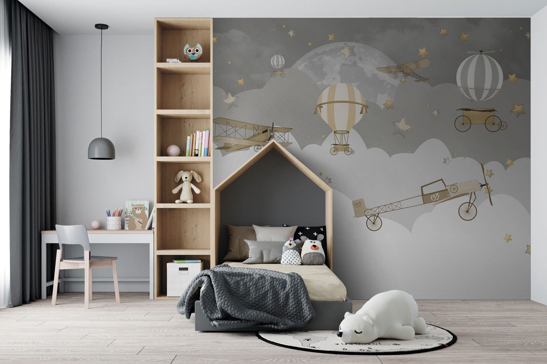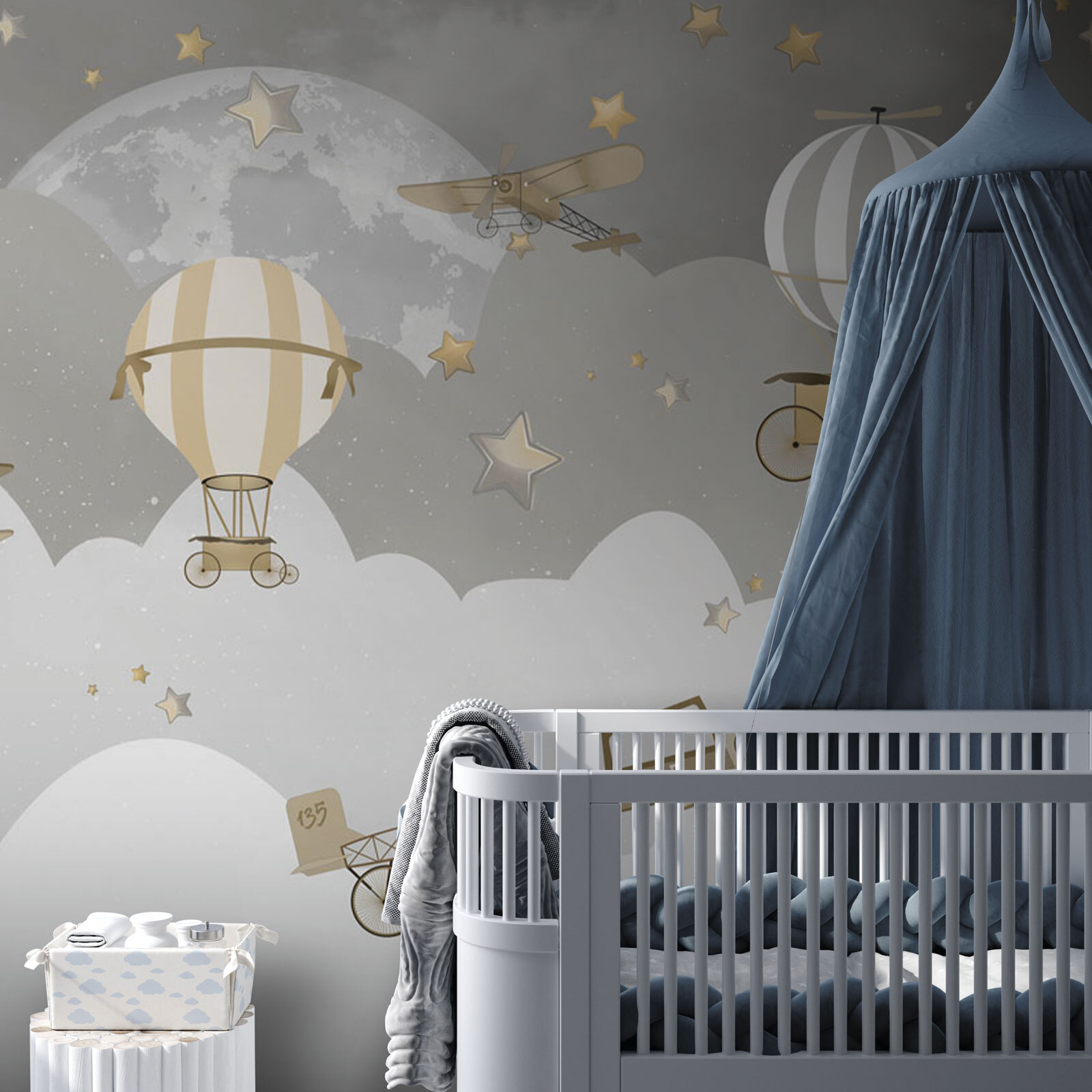 Imagine-se a voar alto sobre nuvens e estrelas de sonho com este mural de parede encantador. “Vintage Aircrafts Soaring Through Stars” transporta-o para um céu noturno caprichoso, onde aviões antigos e balões de ar quente flutuam entre estrelas cintilantes. Perfeito para dar um toque nostálgico a qualquer espaço, é um êxito tanto para crianças como para adultos. Os mais pequenos podem sentir que estão a viver aventuras nocturnas e é também uma excelente peça de conversa para um quarto de hóspedes. As cores suaves tornam esta peça versátil – é calma, mas ainda assim cheia de charme e carácter. Sonhadora e encantadora, é como uma doce história de embalar em forma de mural.