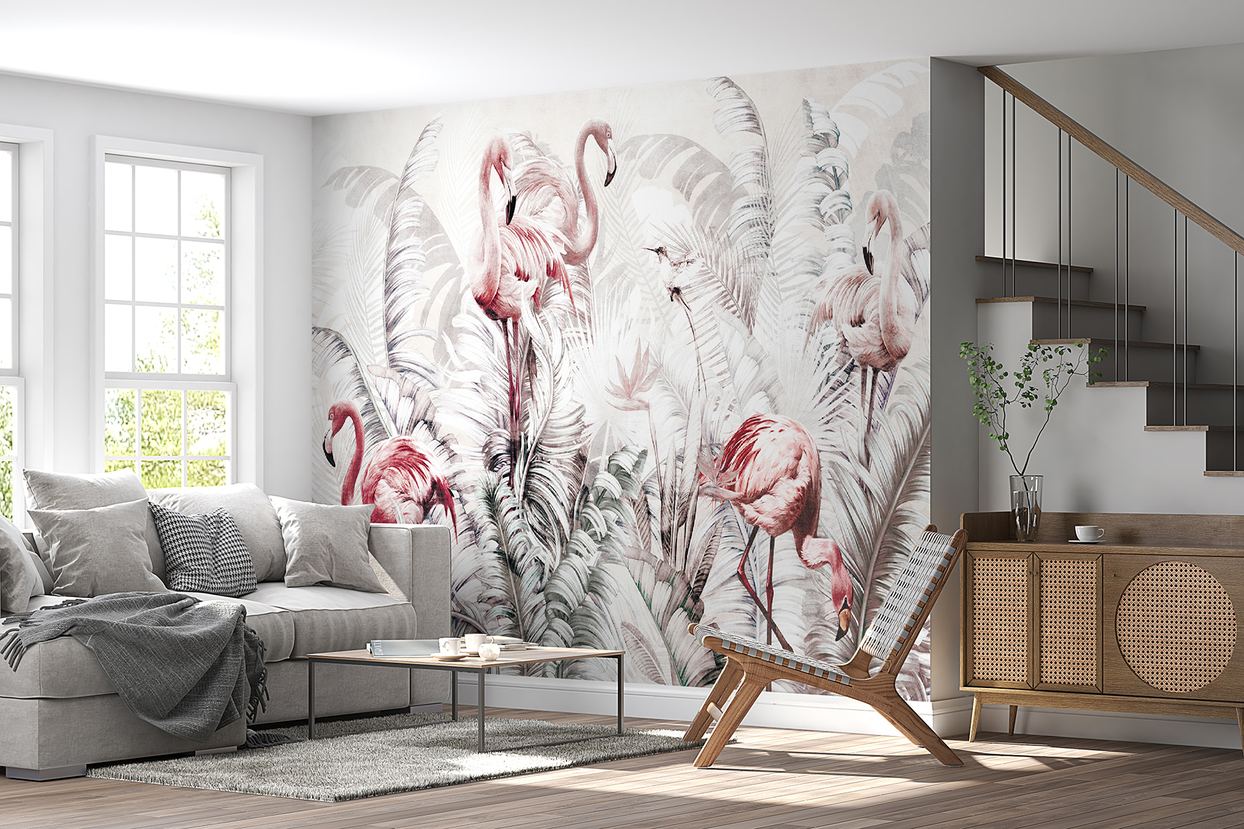 Quer seja para a sua sala de estar, quarto, ou mesmo para um espaço de escritório criativo, este mural acrescenta um toque lúdico mas sofisticado. Os tons pastel suaves misturam-se sem esforço com o rosa flamingo arrojado, fazendo com que toda a cena pareça um sonho tranquilo.