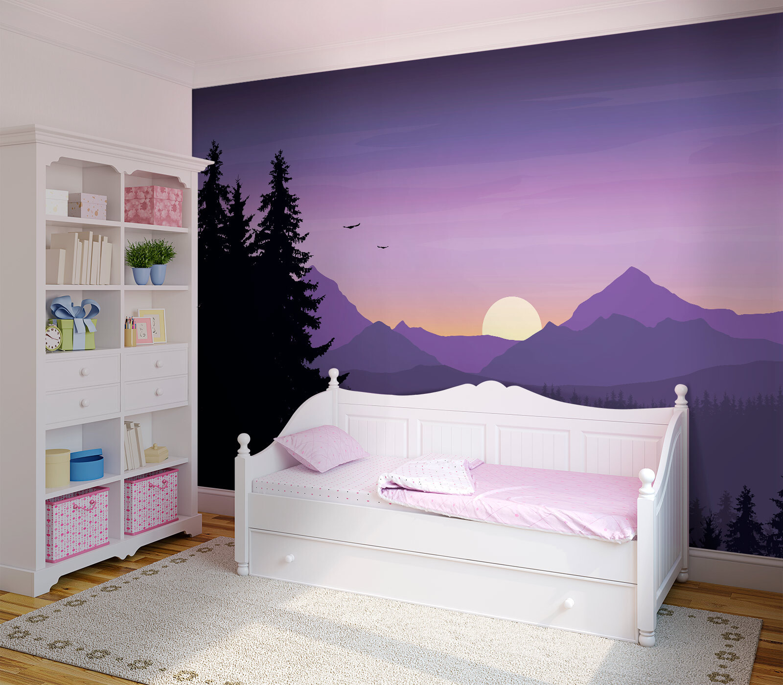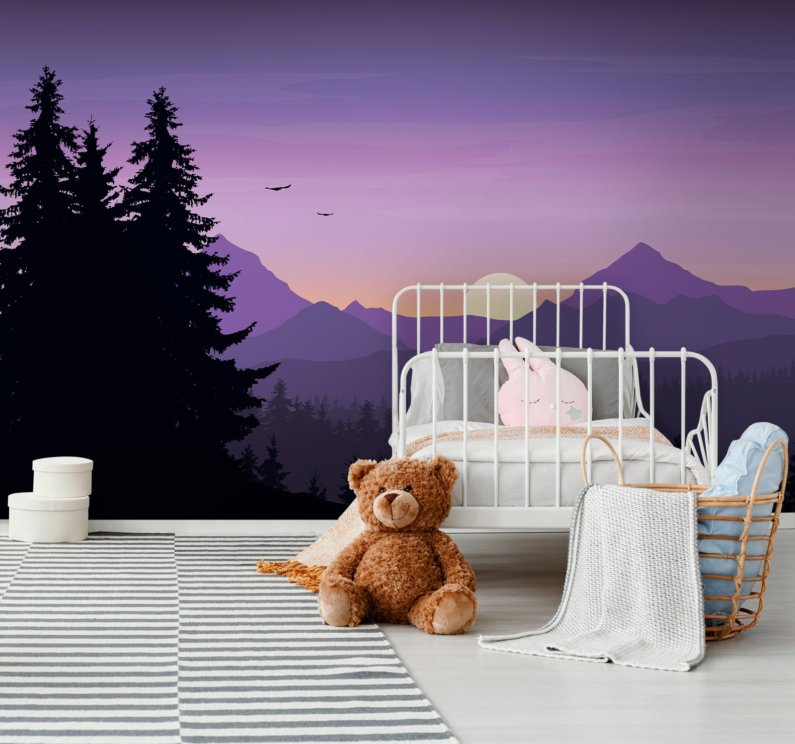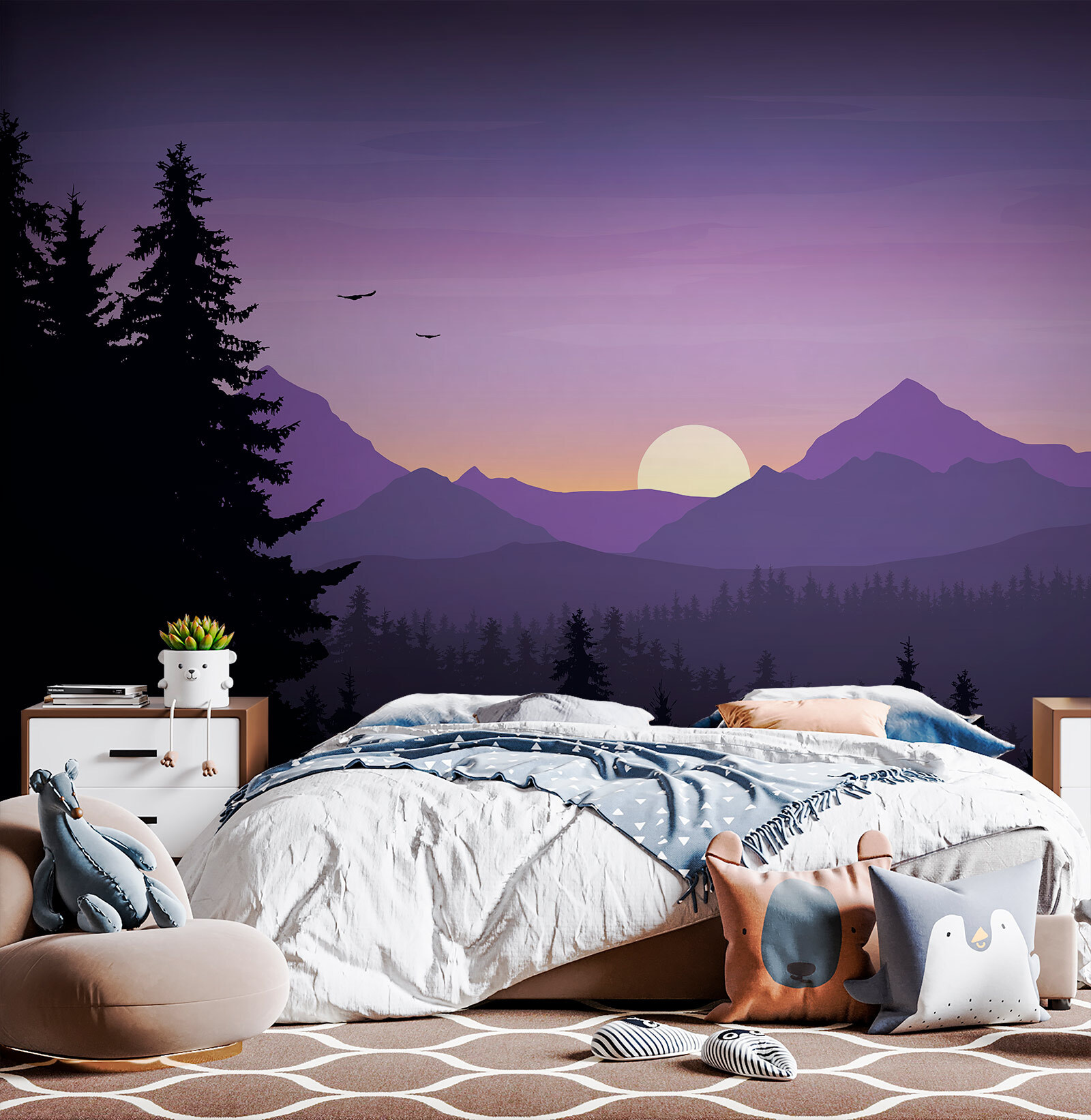 Imagine entrar num refúgio acolhedor, rodeado pela beleza serena da natureza, sem sair de casa. Este mural de parede, com uma paisagem deslumbrante de árvores e montanhas, traz esse sonho diretamente para as suas paredes. Tons suaves de roxo dançam no céu enquanto o sol se põe, lançando um brilho encantador. É como se fosse o seu próprio refúgio tranquilo, onde o stress simplesmente desaparece. Imagine-se enrolado com um bom livro ou a partilhar histórias com amigos, enquanto desfruta desta vista tranquila. Cada olhar para aquelas montanhas majestosas e árvores altas pode inspirar uma pequena aventura — ou, pelo menos, alguns devaneios sobre ela. Perfeito para os amantes da natureza e para aqueles que procuram adicionar um toque de calma ao seu espaço. Porque não deixar as suas paredes falarem por si? Afinal, quem não gostaria de ter um pouco do ar livre dentro de casa?