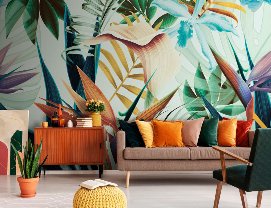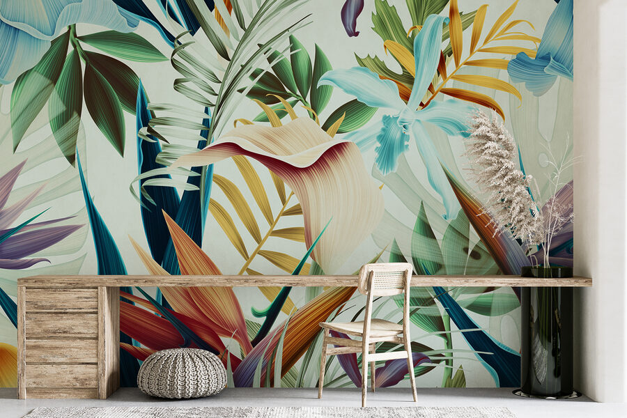 Imagine beber o seu café da manhã com um pano de fundo de folhagem vibrante – parece que está numa selva tropical mesmo na sua sala de estar. Cada folha e cada flor parece ter sido pintada por um artista botânico com uma grande paixão por cores fortes e marcantes. Não é apenas papel de parede; é uma experiência, injectando vida e um toque de natureza selvagem no seu espaço.