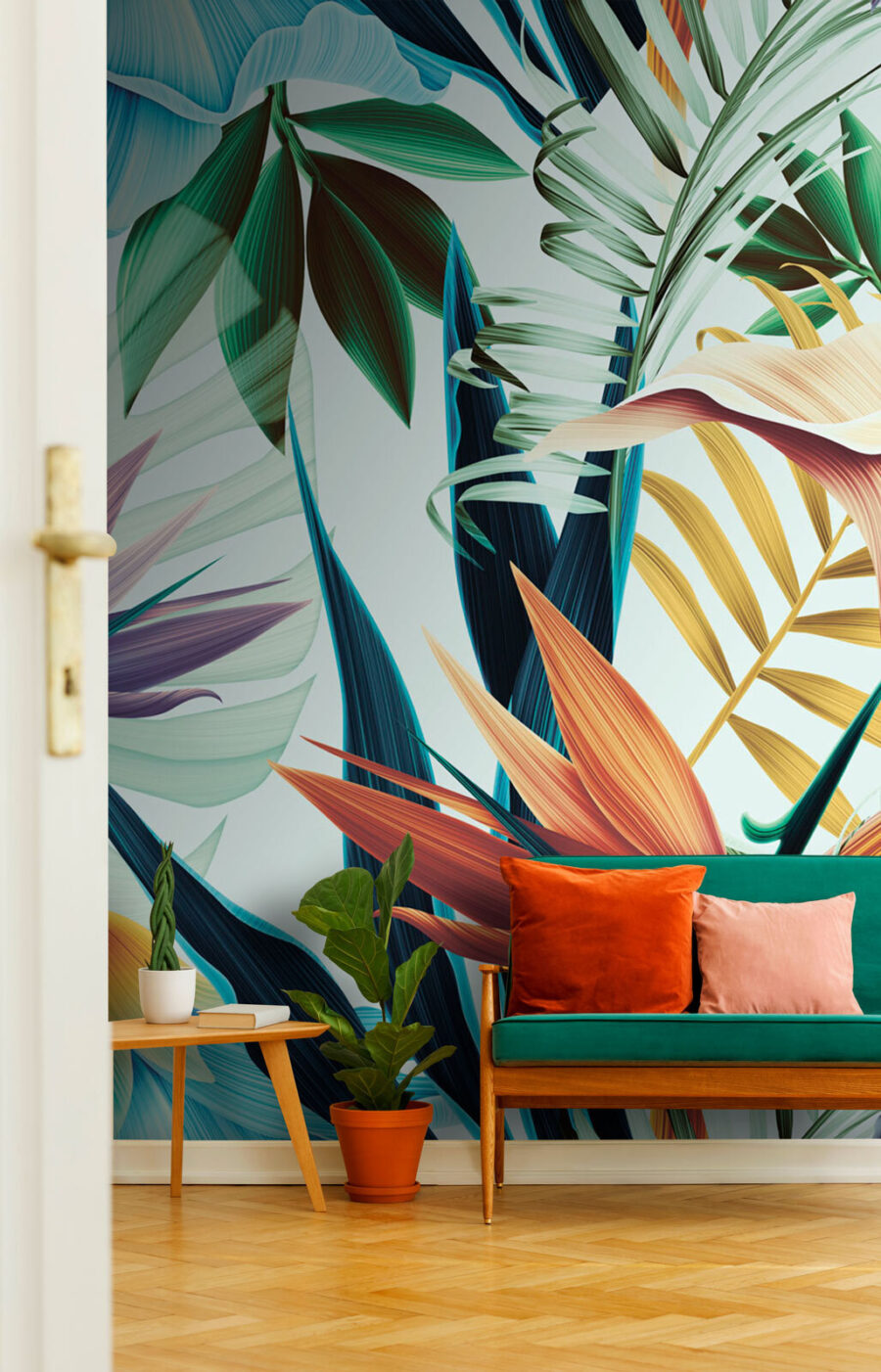 Por isso, se gosta de uma decoração única que seja simultaneamente apelativa e emocionalmente edificante, este mural tem o seu nome escrito por todo o lado. E sejamos honestos – quem é que não precisa de um pouco de alegria colorida e uma pitada de selva em casa?