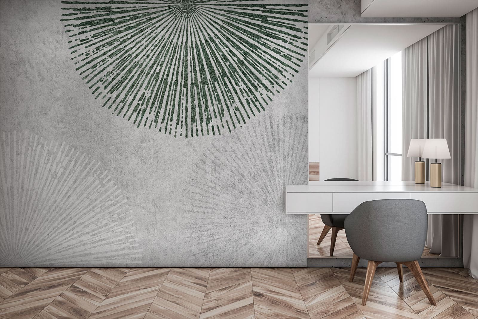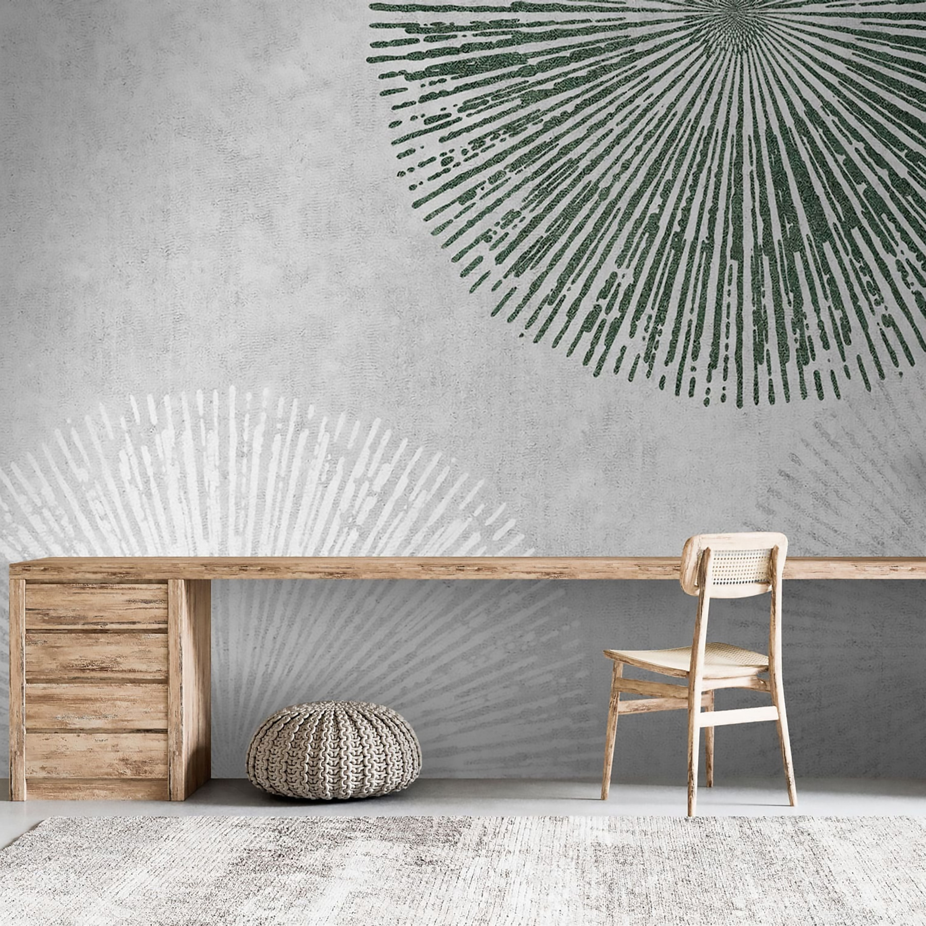 Transforme o seu espaço com este mural de parede cativante que apresenta padrões radiais divertidos num cenário único. Imagine: uma sala de estar que de repente se parece menos com o antigo apartamento de solteiro do seu primo e mais com um café artístico na cidade. Os verdes e brancos suaves criam um ambiente tranquilo, facilitando o relaxamento após um longo dia. Os hóspedes sentir-se-ão atraídos, com a curiosidade aguçada. É como namoriscar com a geometria – arrojada, divertida, mas com estilo sem esforço. Pode dar por si a sonhar acordado enquanto olha para ela, cada pequeno detalhe a despertar a sua imaginação. Perfeito para quem quer um toque chique sem complicações.