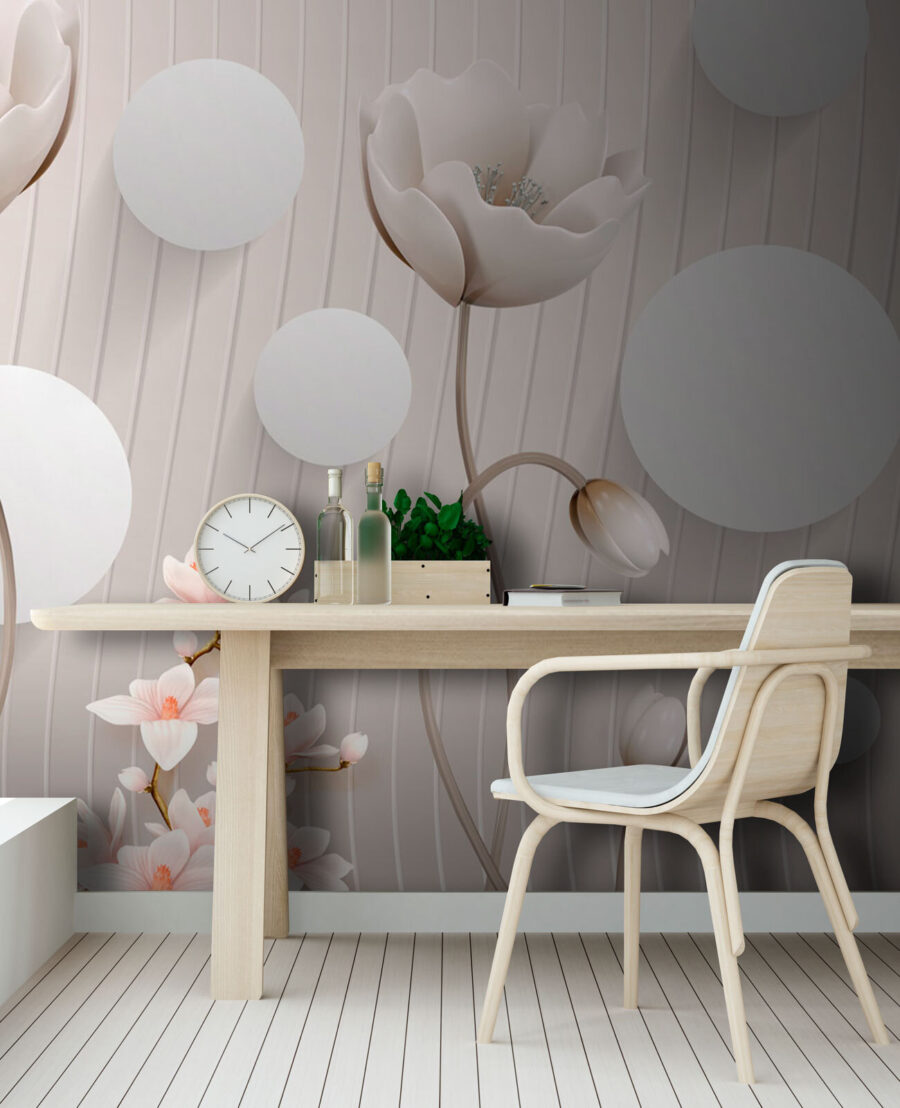 Transforme qualquer espaço com este deslumbrante mural de parede com flores delicadas e círculos divertidos. Imagine entrar numa sala onde as flores suaves convidam à tranquilidade e ao encanto. É como uma brisa suave depois de um longo dia, envolvendo-o em calor e facilidade. Perfeito para iluminar um recanto de leitura acolhedor ou animar um corredor sem graça. Estas cores subtis combinam na perfeição com quase todos os estilos de decoração, dando-lhe uma sensação de estilo sem esforço. Os convidados vão pensar que contratou um designer. Além disso, é um lembrete de que a vida é demasiado curta para não acrescentar um pouco de beleza.