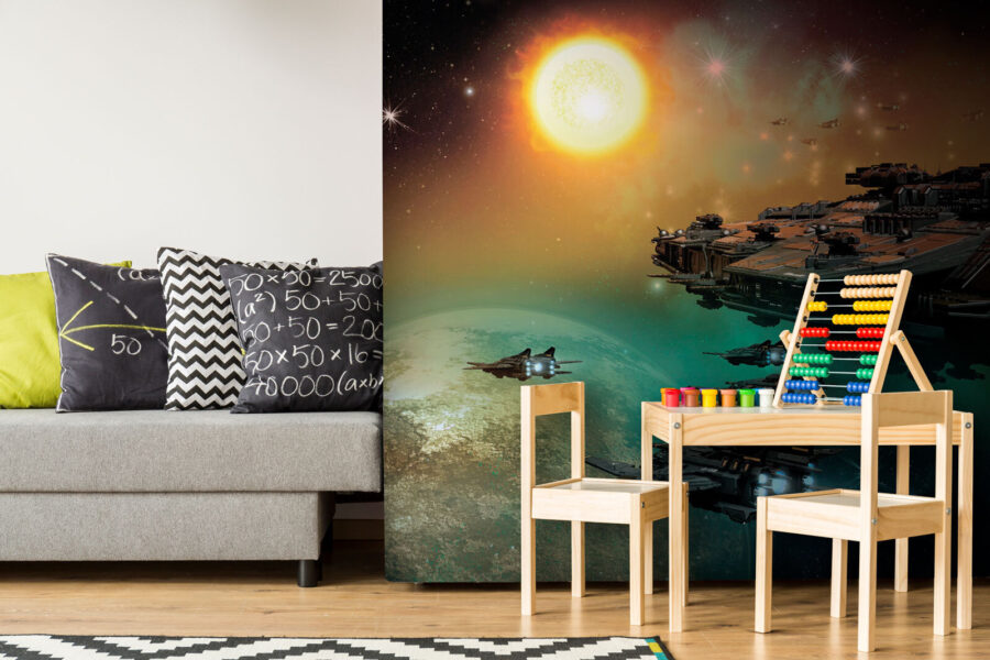 Perfeito para a sala de qualquer amante do espaço ou para o quarto do seu filho – as naves estelares detalhadas, o sol brilhante e os planetas longínquos fazem com que a sala pareça uma cena saída diretamente de um êxito de bilheteira de ficção científica. Tem este ambiente mágico que o fará sonhar acordado com galáxias muito, muito distantes. Além disso, é muito mais fixe do que olhar para uma simples parede, certo? Quase se consegue ouvir o zumbido dos motores e sentir a emoção da exploração espacial. A sério, é capaz de o inspirar a tornar-se um astronauta… ou, pelo menos, a rever os seus filmes espaciais favoritos. Acrescente um pouco do universo à sua vida quotidiana – traga as estrelas para casa!