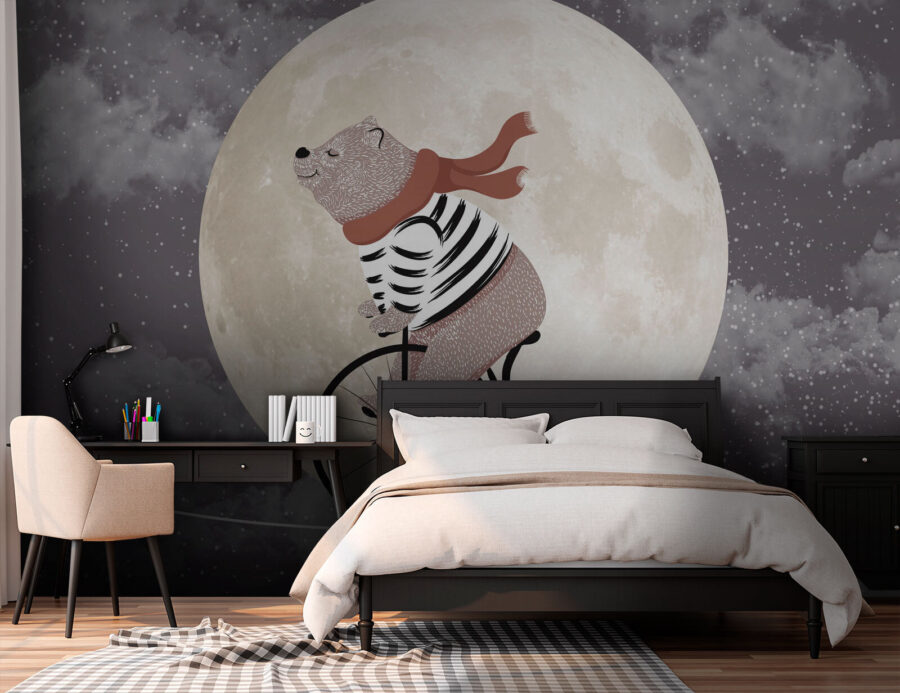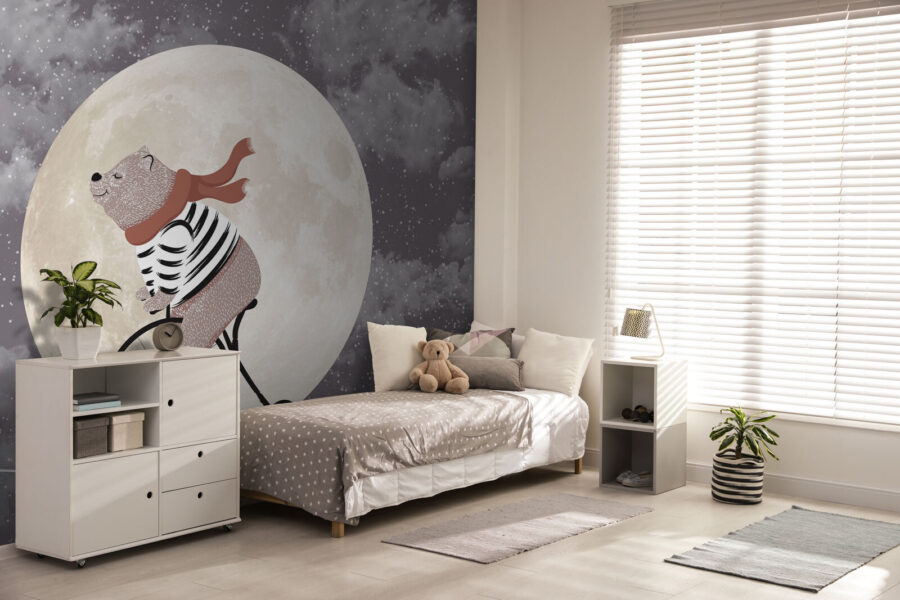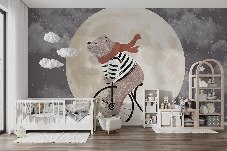 Imagine um quarto de crianças acolhedor, onde as histórias para adormecer ganham vida nas paredes. O mural “Bear rides bike across the moon” traz essa vibração mágica diretamente para qualquer espaço infantil. É extravagante, com este urso encantador com uma camisa às riscas e um cachecol a pedalar através de uma lua gigante e brilhante. Não há necessidade de pensar demasiado – é simplesmente divertido e peculiar. Perfeito para despertar a imaginação e talvez algumas gargalhadas. Imagine o seu filho a olhar para isto todas as noites e a sonhar grandes sonhos. É esse o tipo de calor que este mural traz.
