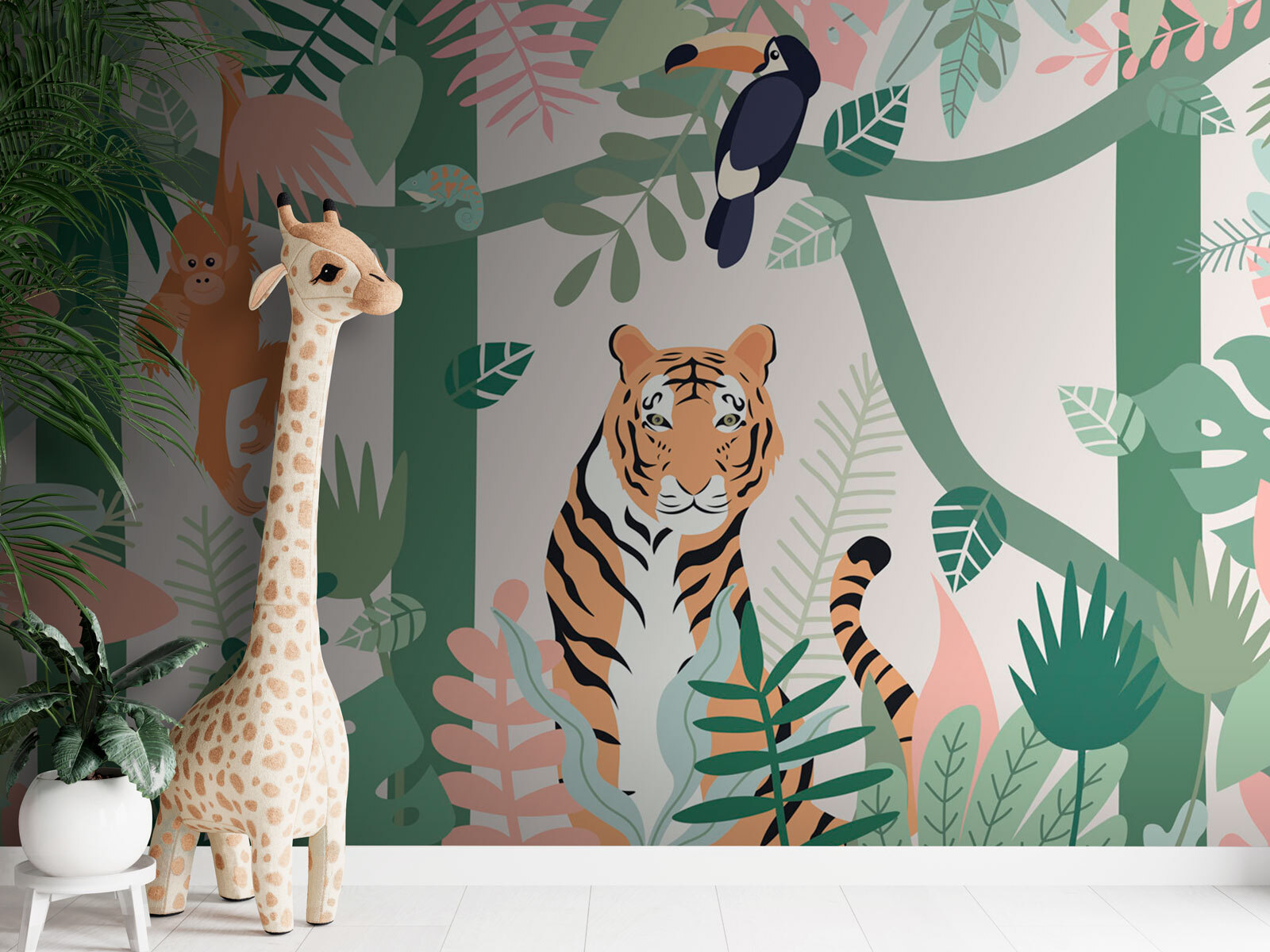 Imagine transformar o quarto do seu pequeno com este mural de parede animado e adorável “Cartoon of an Orangutan”! Perfeito para crianças, bebés ou qualquer pessoa de coração jovem, este mural está cheio de charme. O orangotango de olhos arregalados pendurado na folhagem parece estar a balançar diretamente para o quarto, pronto para algumas brincadeiras. Um tigre feroz, mas calmo, um tucano curioso e um camaleão sorrateiro acrescentam ainda mais vibrações da selva que irão desencadear histórias e aventuras sem fim.