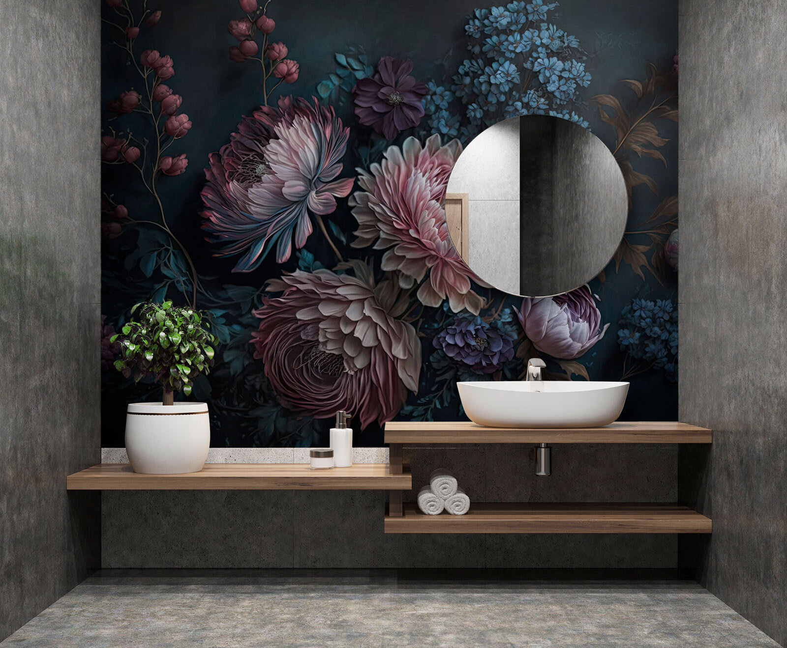 Transforme uma parede sem graça num país das maravilhas botânico com este mural floral vibrante. Imagine flores exuberantes em tons ricos e escuros, convidando a um ambiente acolhedor que parece um jardim secreto – perfeito para sonhar acordado ou passar um momento de silêncio. Imagine-se a organizar uma reunião e toda a gente acaba a conversar sobre aquelas pétalas deslumbrantes. A forma como as cores dançam com a luz dá-lhe vontade de se sentar e beber chá durante horas. Um ótimo início de conversa! As suas paredes merecem um pouco de amor, e este mural pode ser apenas o bilhete para uma ligação inesperada e bonita.