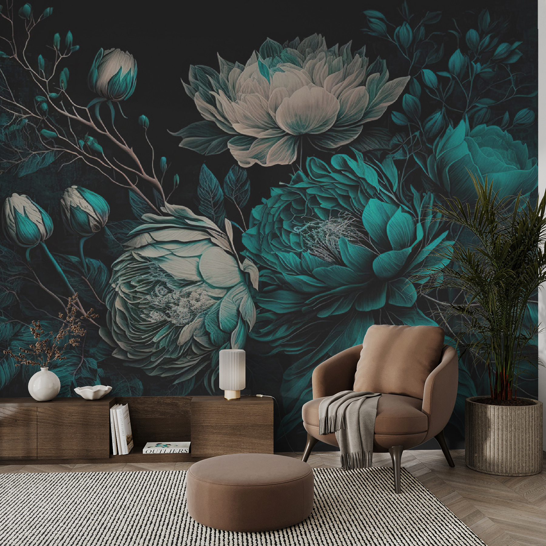 1 avaliação de Papel de parede Flores vibrantes desabrocham em tons de azul-petróleo