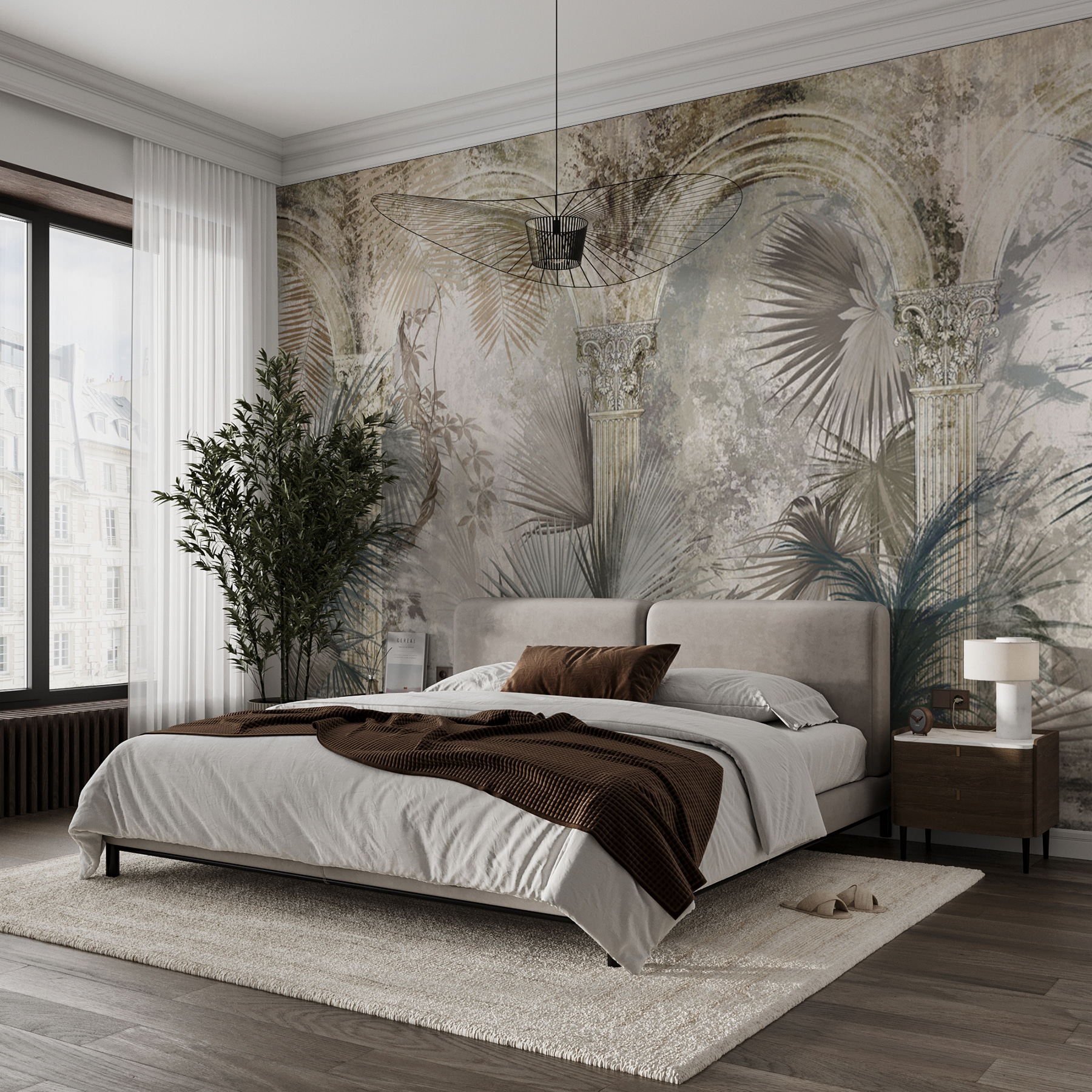 Imagine chegar a casa e encontrar um pequeno pedaço do paraíso com um encanto antigo. Este mural tem toda esta vibração de arcos do velho mundo e selva exuberante que é simplesmente encantadora. É como um jardim secreto mesmo na sua parede! Perfeito para quem gosta desse aspeto sonhador, quase mítico. Pense em manhãs acolhedoras com um café, sentindo-se como se tivesse recuado no tempo. Além disso, as texturas subtis e os verdes e cinzentos de tons frios? Sim, são super calmantes. É simultaneamente elegante e de espírito livre – ideal para criar o seu próprio espaço sereno.
