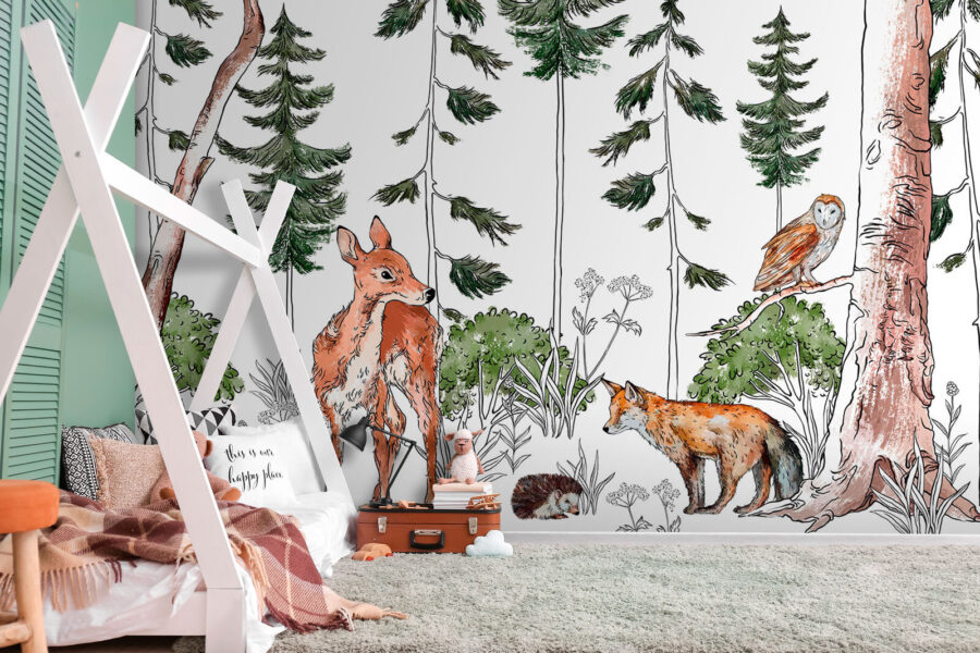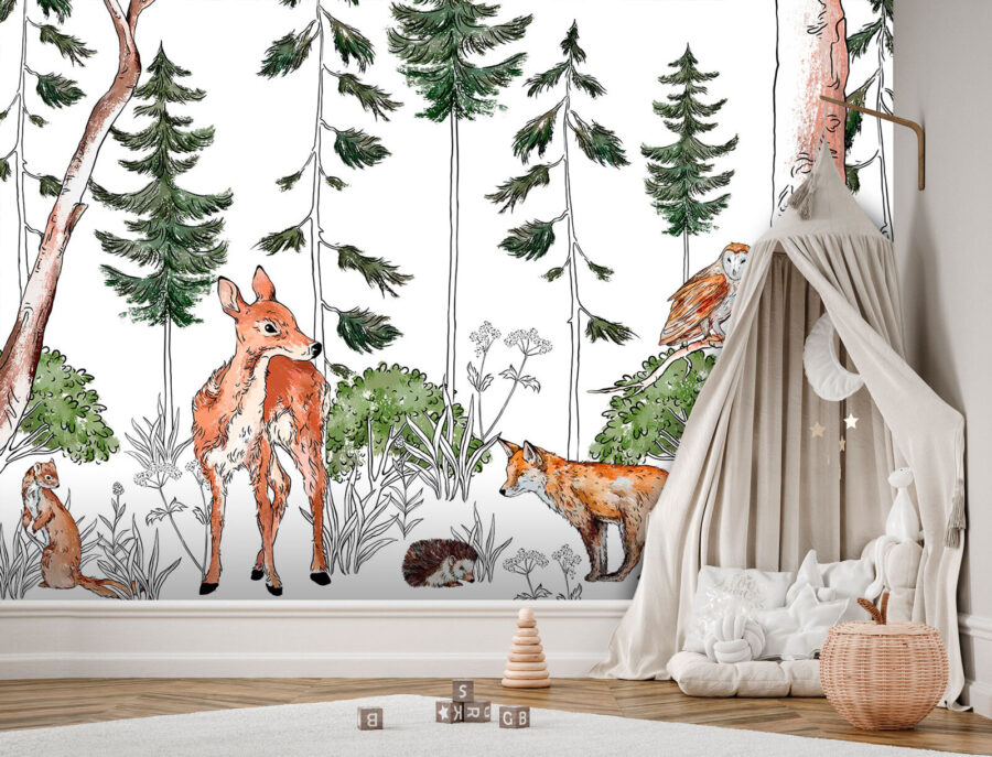 Transforme qualquer espaço com este encantador mural de parede com um delicioso elenco de criaturas da floresta! Imagine uma cena serena na floresta, onde um veado curioso e uma raposa brincalhona vagueiam entre a vegetação exuberante. Uma coruja observa de cima, adicionando um toque de fantasia. É como ter um pedaço da natureza na sua parede. Perfeito para um recanto de leitura aconchegante ou para o quarto de uma criança, este mural convida o ar livre a entrar, tornando cada olhar uma pequena aventura. Espalhe alegria e calor humano e deixe a história se desenrolar na sua própria floresta encantada — nunca há um momento de tédio com esses amigos peludos!