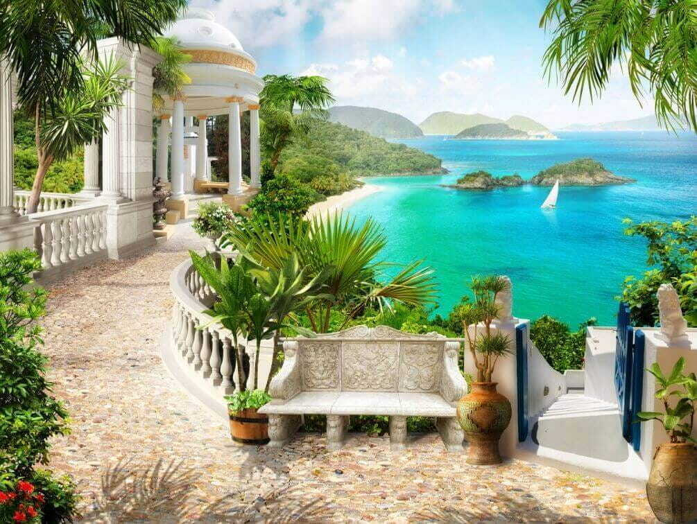 Imagine isto: entrar no seu quarto e ser instantaneamente transportado para um paraíso sereno à beira-mar. É exatamente isso que o “Papel de parede Plant in a Pot” faz. É como ter um local de mini-férias mesmo na sua parede. Aquelas plantas verdes exuberantes, o pavilhão branco pacífico e aquela água azul-turquesa de cortar a respiração – é a serenidade perfeita!