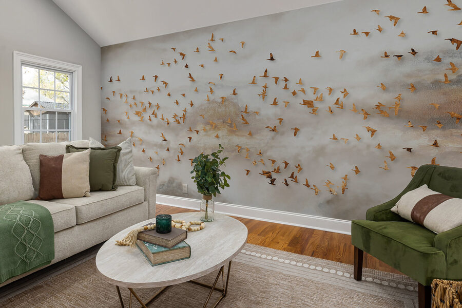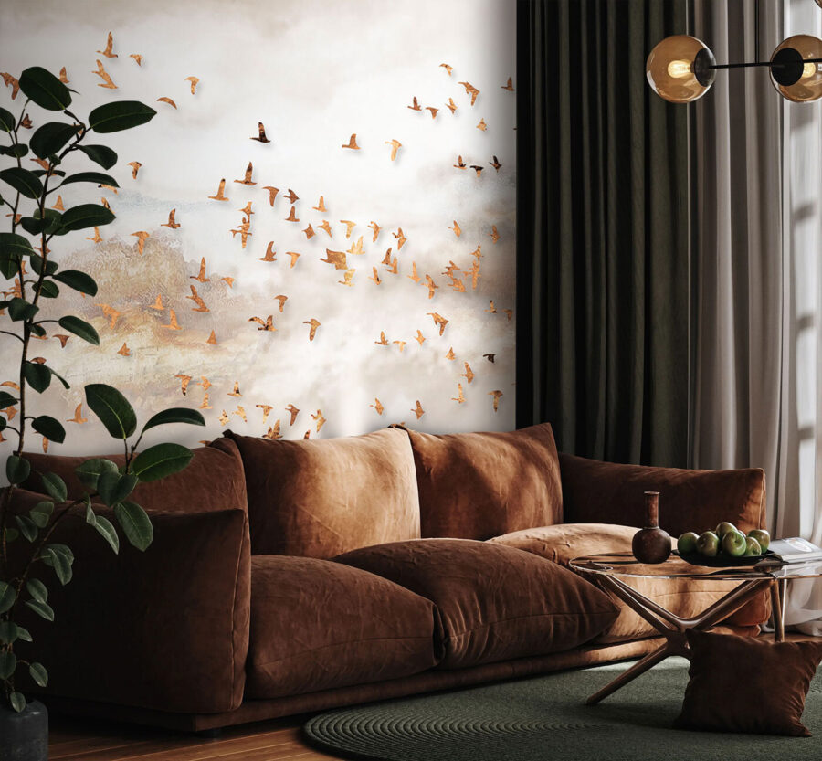 Transforme qualquer divisão numa fuga serena com este deslumbrante mural de parede de um grupo de pássaros a voar através de um céu de sonho. As cores suaves e os pássaros graciosos criam um ambiente calmo e estimulante, como uma brisa fresca num dia de primavera. Imagine-se a bebericar o café da manhã ou a relaxar após um longo dia enquanto contempla esta cena cativante. Atrai-o, despertando devaneios e histórias. Além disso, dá um toque chique a qualquer espaço, quer se trate de uma sala de estar acolhedora ou de um quarto tranquilo. Quem não gostaria de se sentir como se estivesse a voar por entre as nuvens?