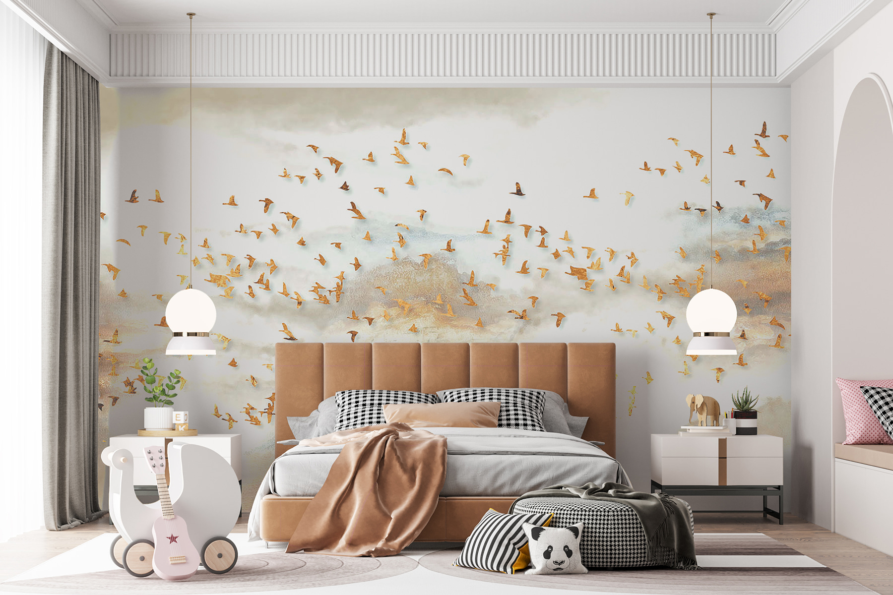 Transforme qualquer divisão numa fuga serena com este deslumbrante mural de parede de um grupo de pássaros a voar através de um céu de sonho. As cores suaves e os pássaros graciosos criam um ambiente calmo e estimulante, como uma brisa fresca num dia de primavera. Imagine-se a bebericar o café da manhã ou a relaxar após um longo dia enquanto contempla esta cena cativante. Atrai-o, despertando devaneios e histórias. Além disso, dá um toque chique a qualquer espaço, quer se trate de uma sala de estar acolhedora ou de um quarto tranquilo. Quem não gostaria de se sentir como se estivesse a voar por entre as nuvens?