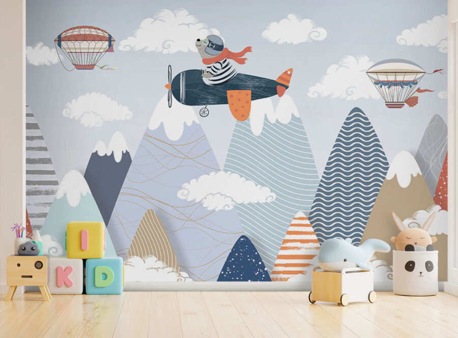 Imagine entrar no quarto do seu filho e ser recebido por uma cena extravagante que parece saída diretamente de uma história de aventuras! Este mural de parede, com alegres balões de ar quente a deslizar através de nuvens fofas sobre montanhas coloridas e abstractas, fará com que qualquer espaço se sinta mágico. É perfeito para despertar a imaginação dos seus filhos – eles podem sentir que estão a pilotar a sua própria expedição ao céu. As cores quentes e aconchegantes e os desenhos divertidos conferem-lhe um grande encanto. Perfeito para creches ou salas de jogos, este mural não é apenas decoração, é um portal para aventuras sem fim! Sonha em grande, navega alto!