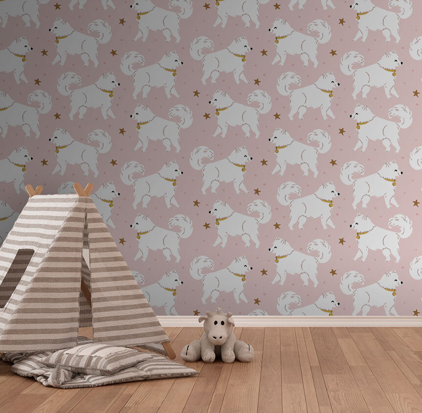 Ilumine qualquer espaço com este encantador mural de parede com cães brancos encantadores a dançar entre pequenas estrelas num fundo cor-de-rosa suave. É como convidar uma matilha de cães brincalhões diretamente para a sala – quão divertido é isso? Perfeito para o espaço de uma criança, acrescenta uma vibração alegre e leve, despertando alegria e criatividade. Imagine a hora do conto ou as brincadeiras sob este design caprichoso; poderia facilmente inspirar risos e uma imaginação sem fim. Então, porque não transformar essas paredes simples num cenário feliz? É um toque lúdico que pode fazer qualquer pessoa sorrir.