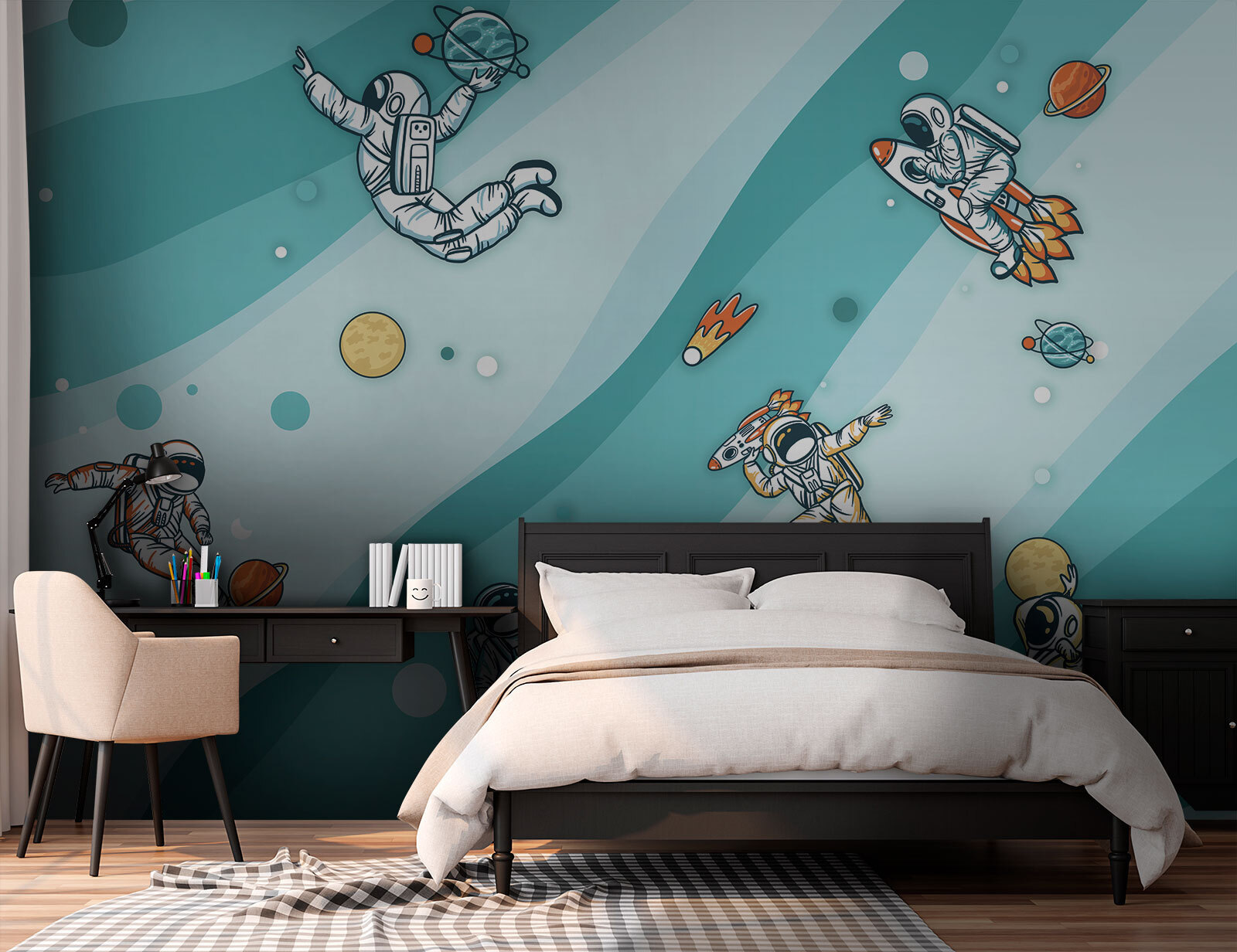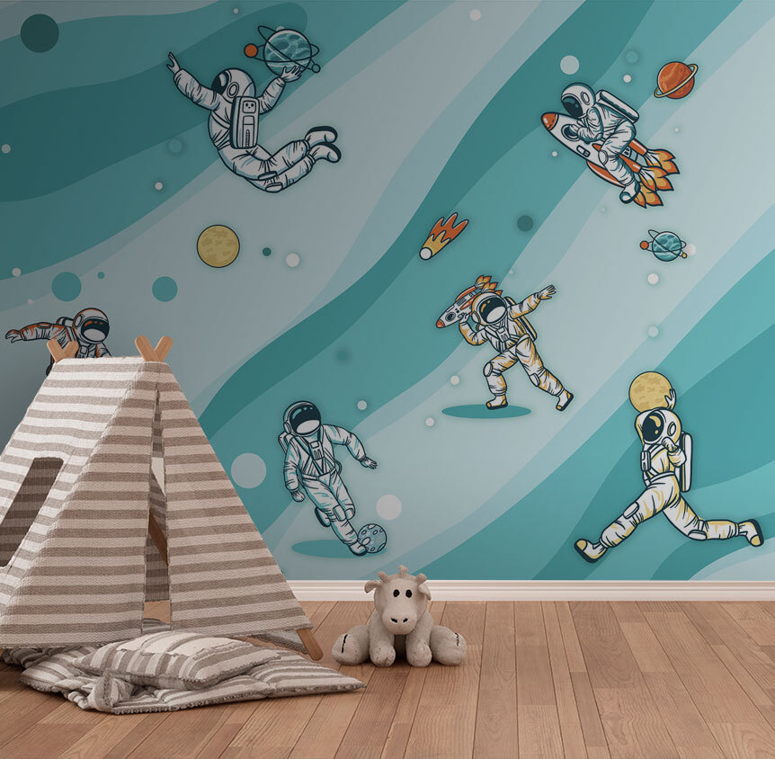 Transforme uma parede simples num parque infantil interestelar com este mural encantador que apresenta um animado grupo de astronautas a flutuar no espaço. Sempre que alguém passar por ali, vai sentir que entrou numa aventura cósmica, com planetas ilustrados a cores, rastos de cometas divertidos e muitas travessuras em gravidade zero. Imagine uma criança apontando alegremente para o mural, dizendo que encontrou um novo amigo espacial, ou um adulto rindo ao ver um astronauta chutando um planeta como se fosse um treino de futebol. O fundo acalmador em aquarela adiciona um toque sonhador, tornando-o perfeito para um quarto, sala de jogos ou até mesmo um espaço de escritório criativo. Não é apenas decoração; é um bilhete para a órbita!
