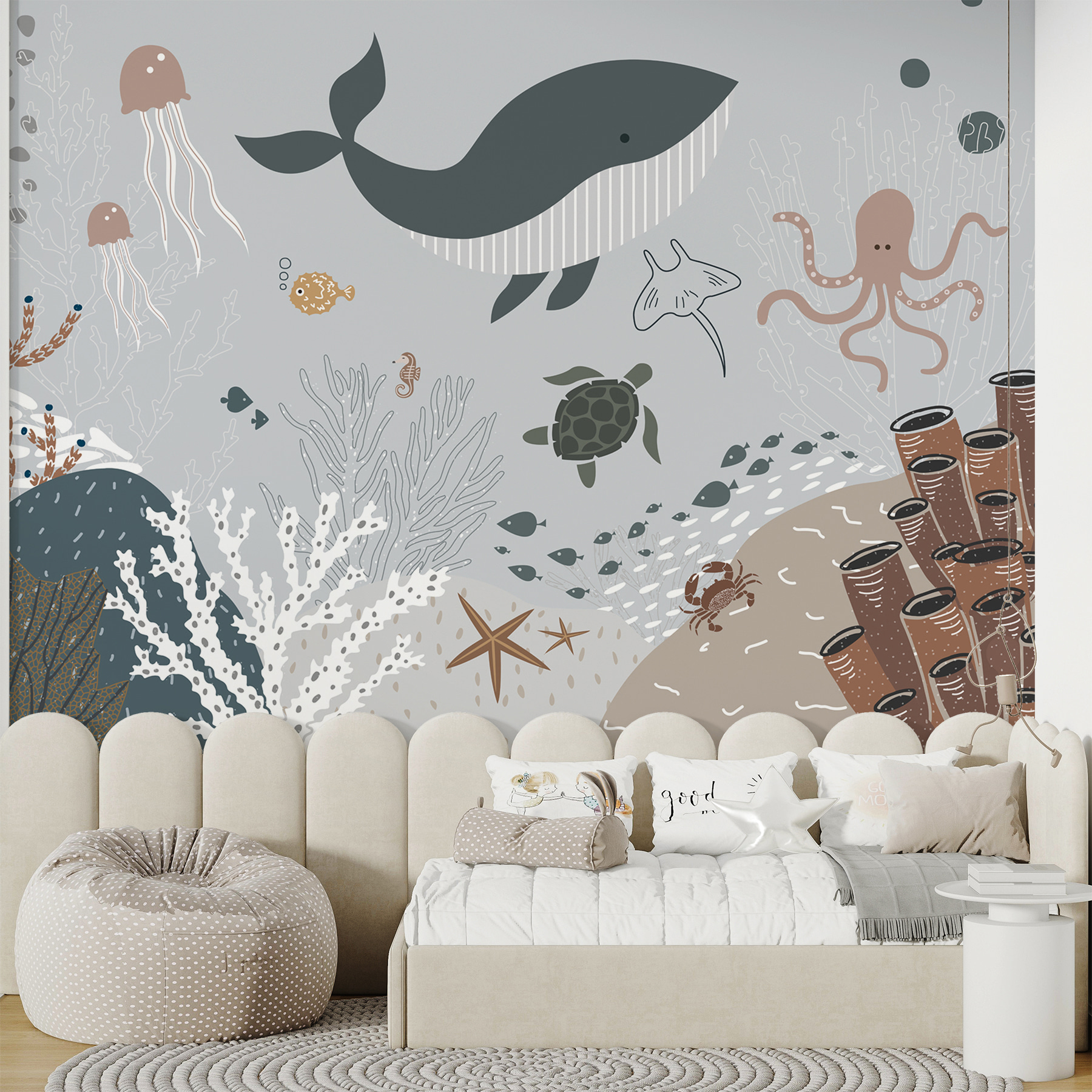 Imagine transformar o quarto do seu filho num mundo subaquático encantador com este mural de parede divertido “Desenho animado de uma baleia”. Perfeito para o quarto de qualquer criança, o mural apresenta criaturas marinhas amigáveis como baleias, tartarugas e medusas em tons suaves de aguarela. É como trazer uma fatia do oceano para a sua casa sem se molhar!